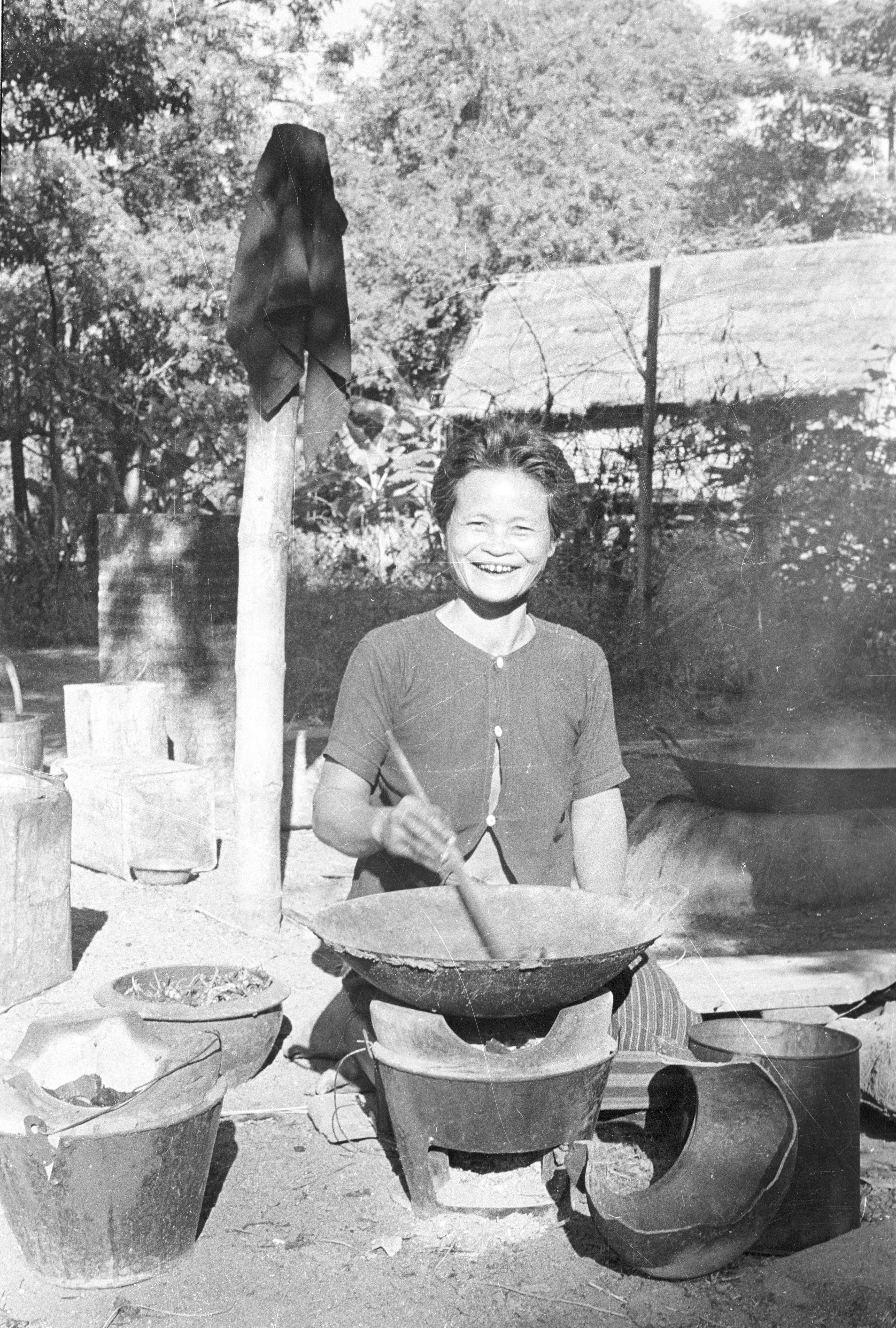 Village woman making food for those building the granary, Ban Nong Tun, Amphoe Muang, Changwat Maha Sarakham, Thailand, December 1963