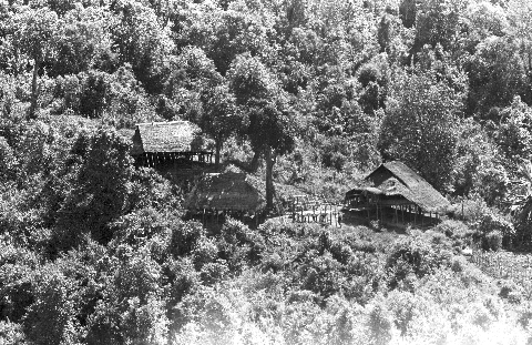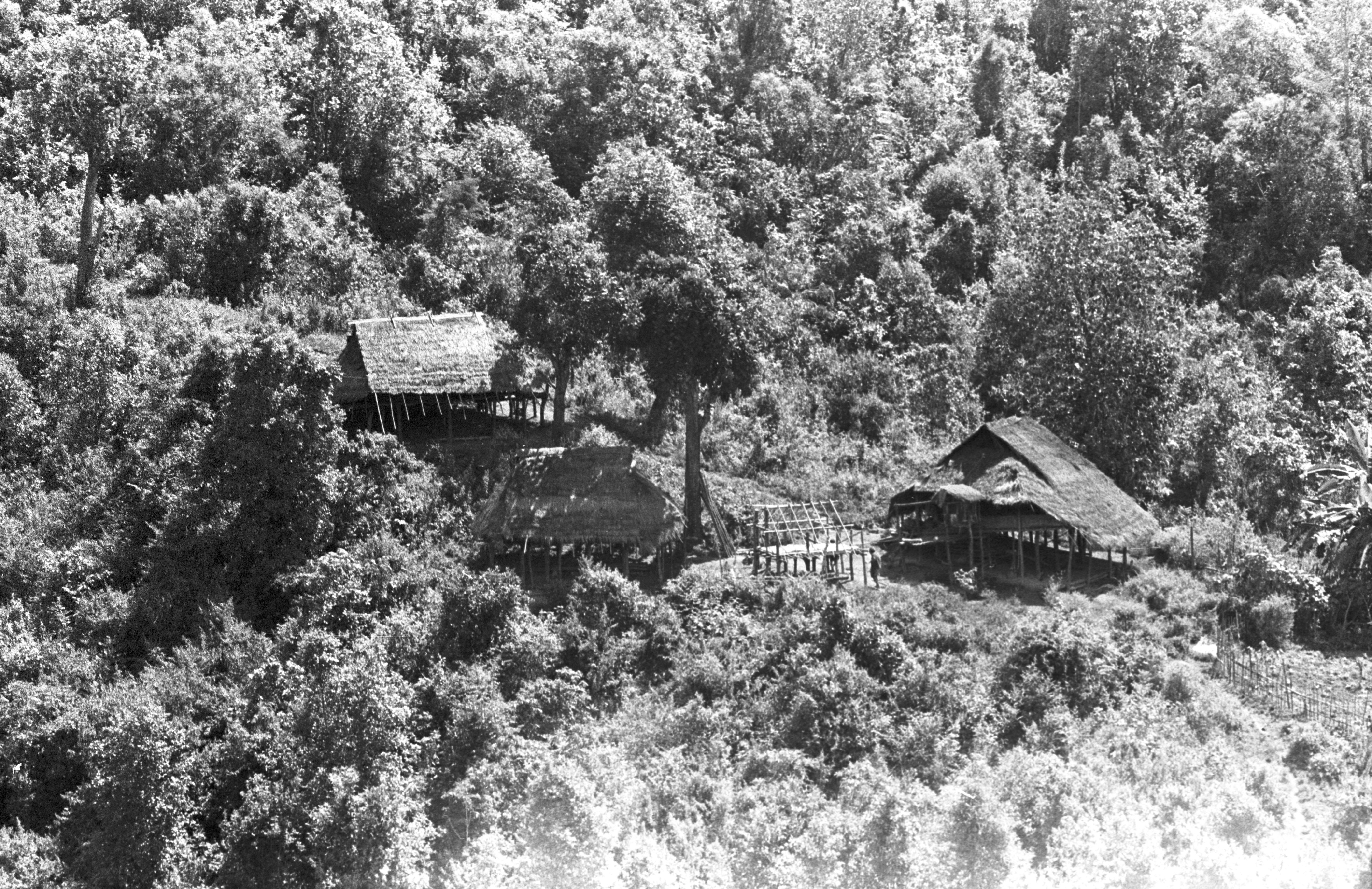S'gaw Karen village: houses in hills and trees, 2 photos, Ban Huai Kung, Thambon Pa Pong, Amphoe Sop Moei, Changwat Mae Hong Son, Thailand, October 1968