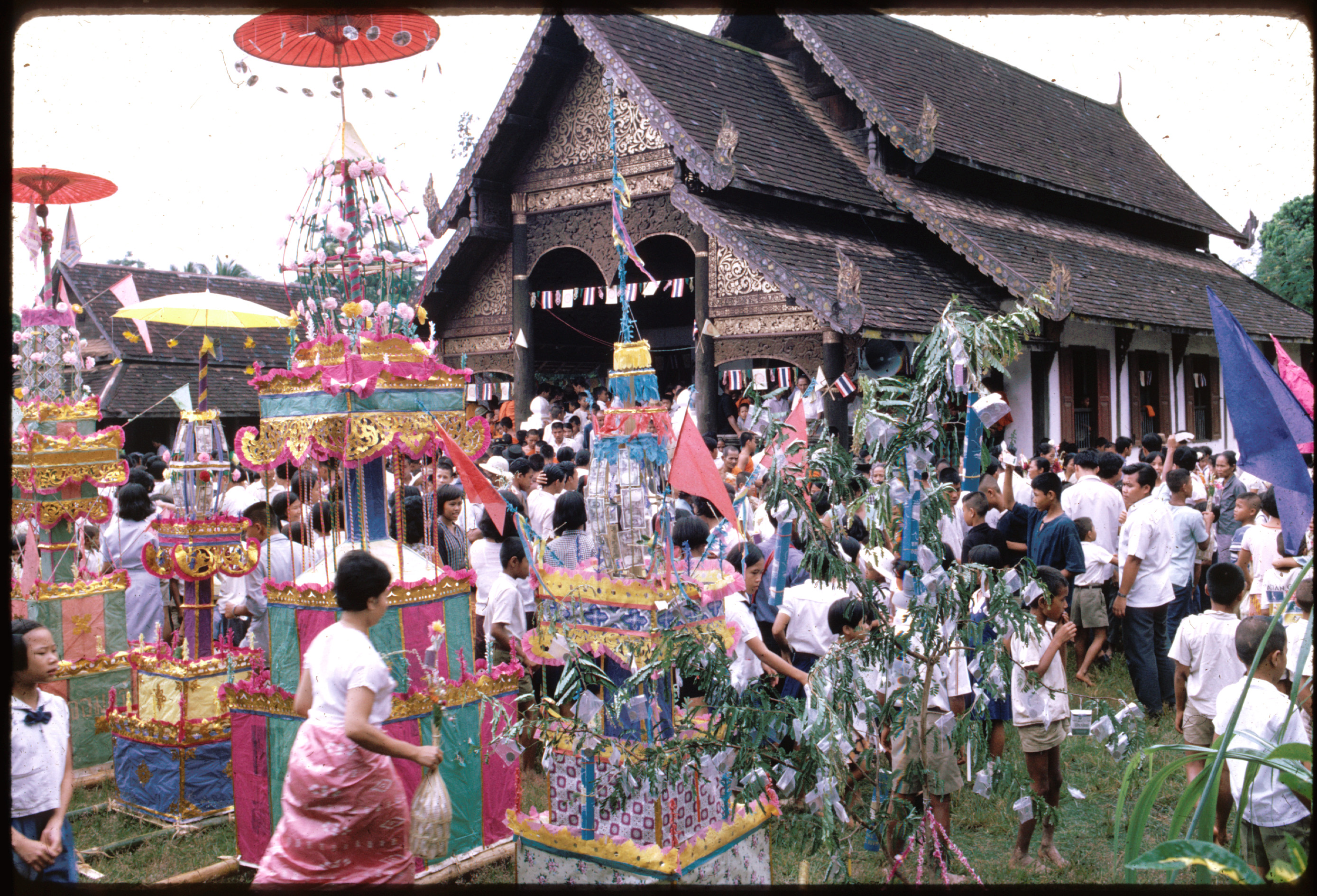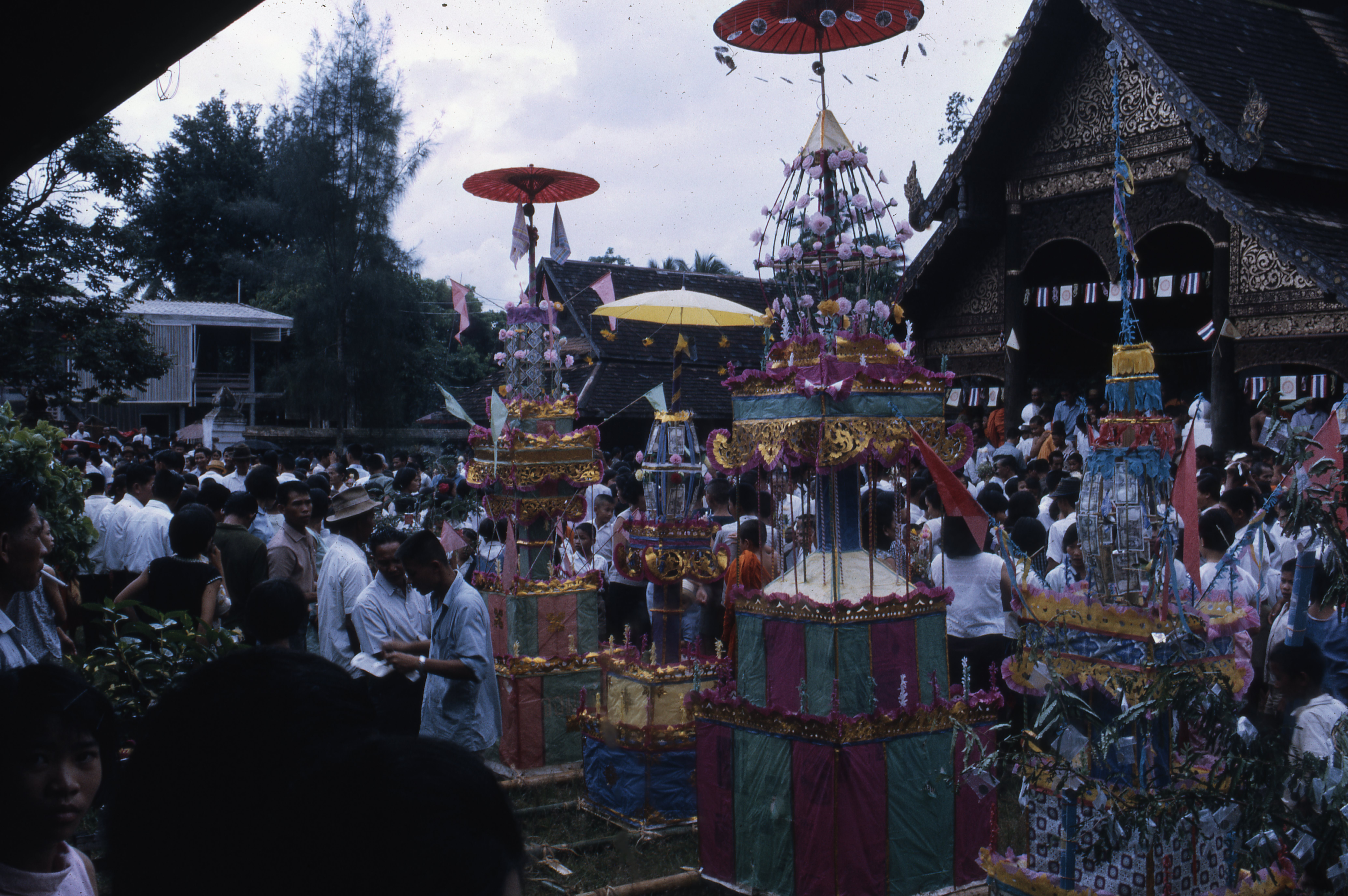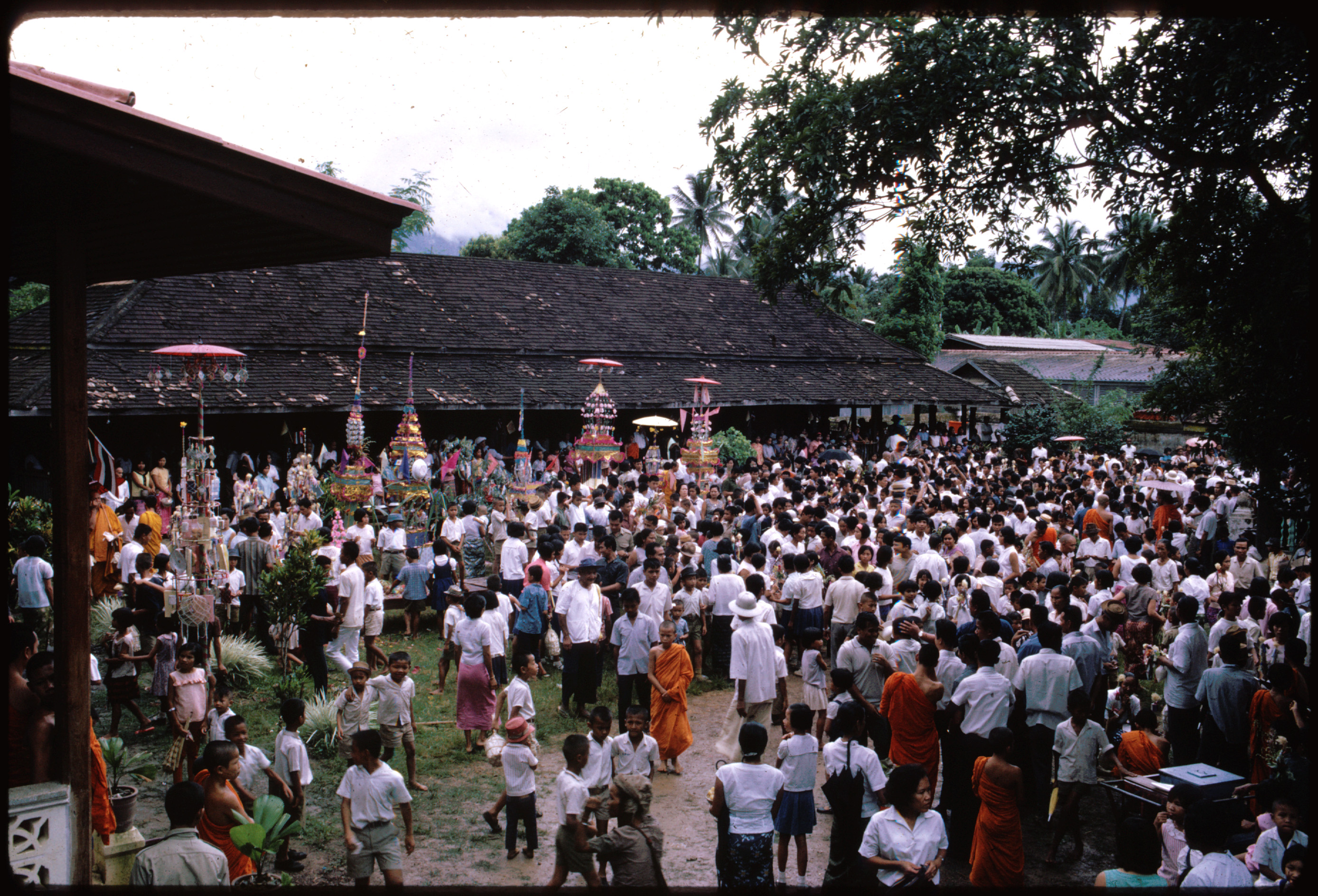 Kin Kuai Salāk or Salākkaphat, collective rite of distributing alms by lottery for merit-making for the dead at Wat Kittiwong – Melee during distribution of offerings by donors to monks, 5 photos, Amphoe Mae Sariang, Changwat Mae Hong Son, Thailand, October 1967
