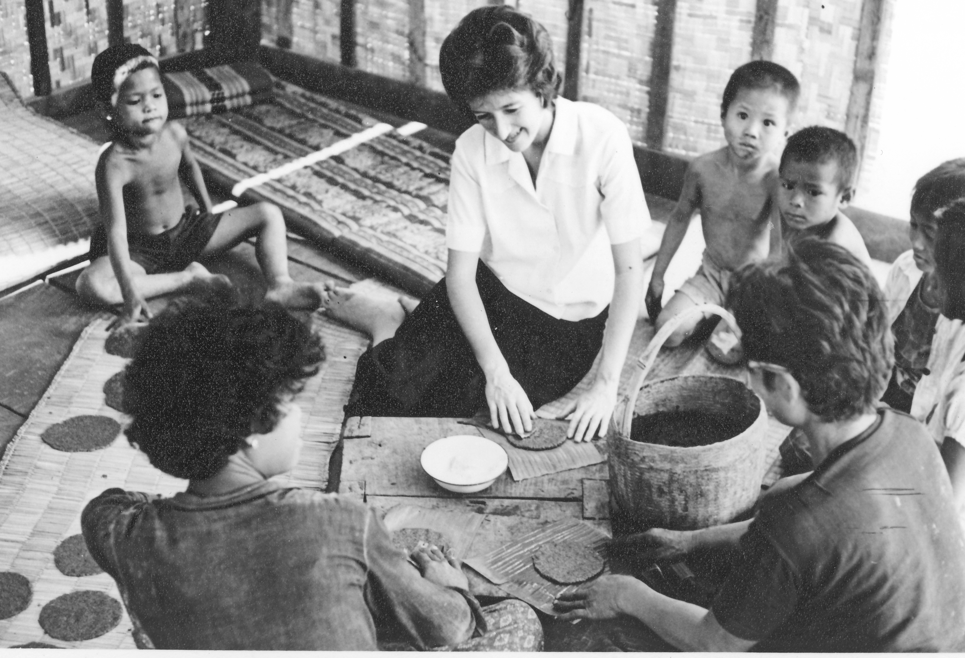 Jane Keyes and village woman’s famiy making khāo kriap / khāo kiap (ข้าวเกรียบ), crispy rice cakes, at the house of village woman, Changwat Maha Sarakham, Thailand, January 1964