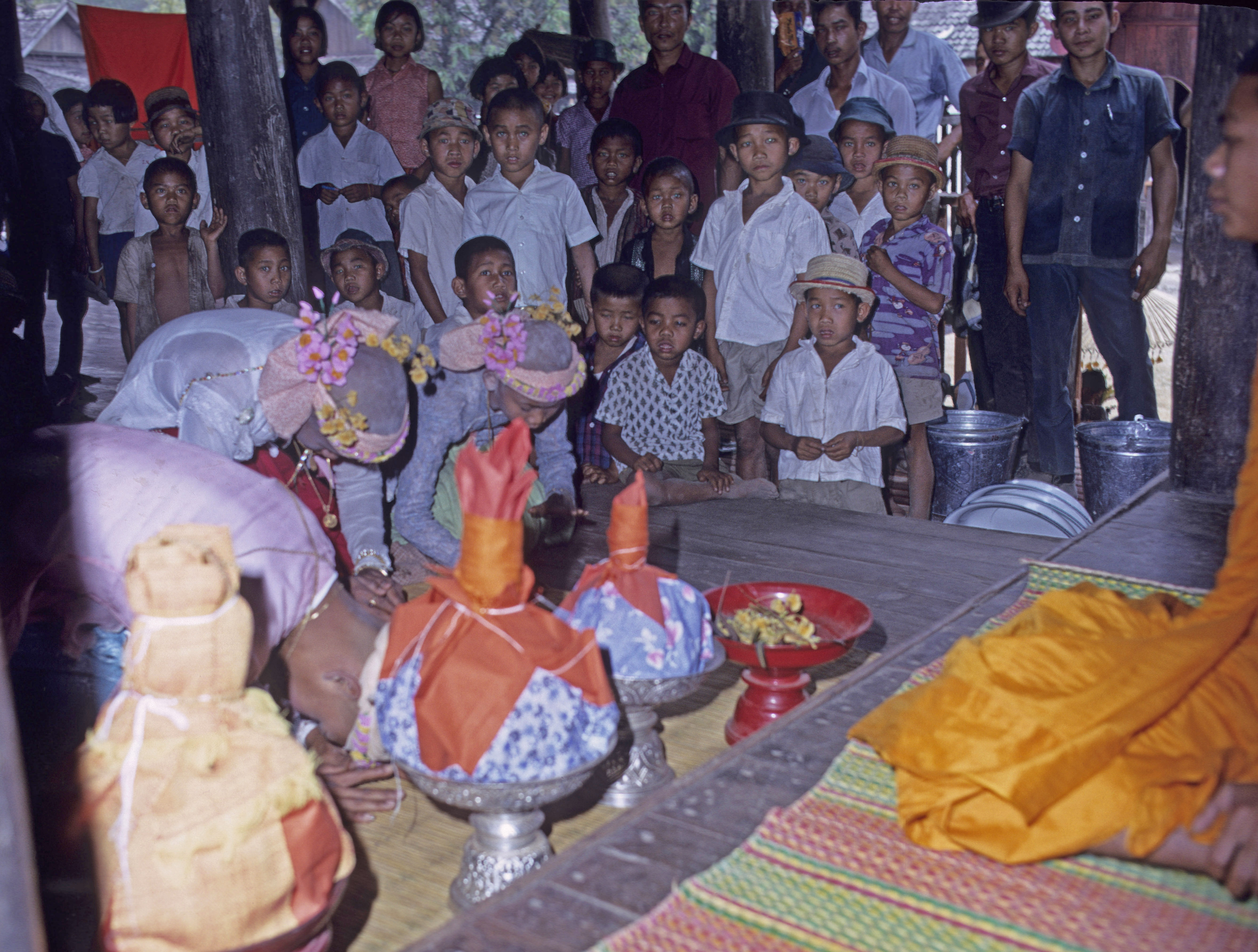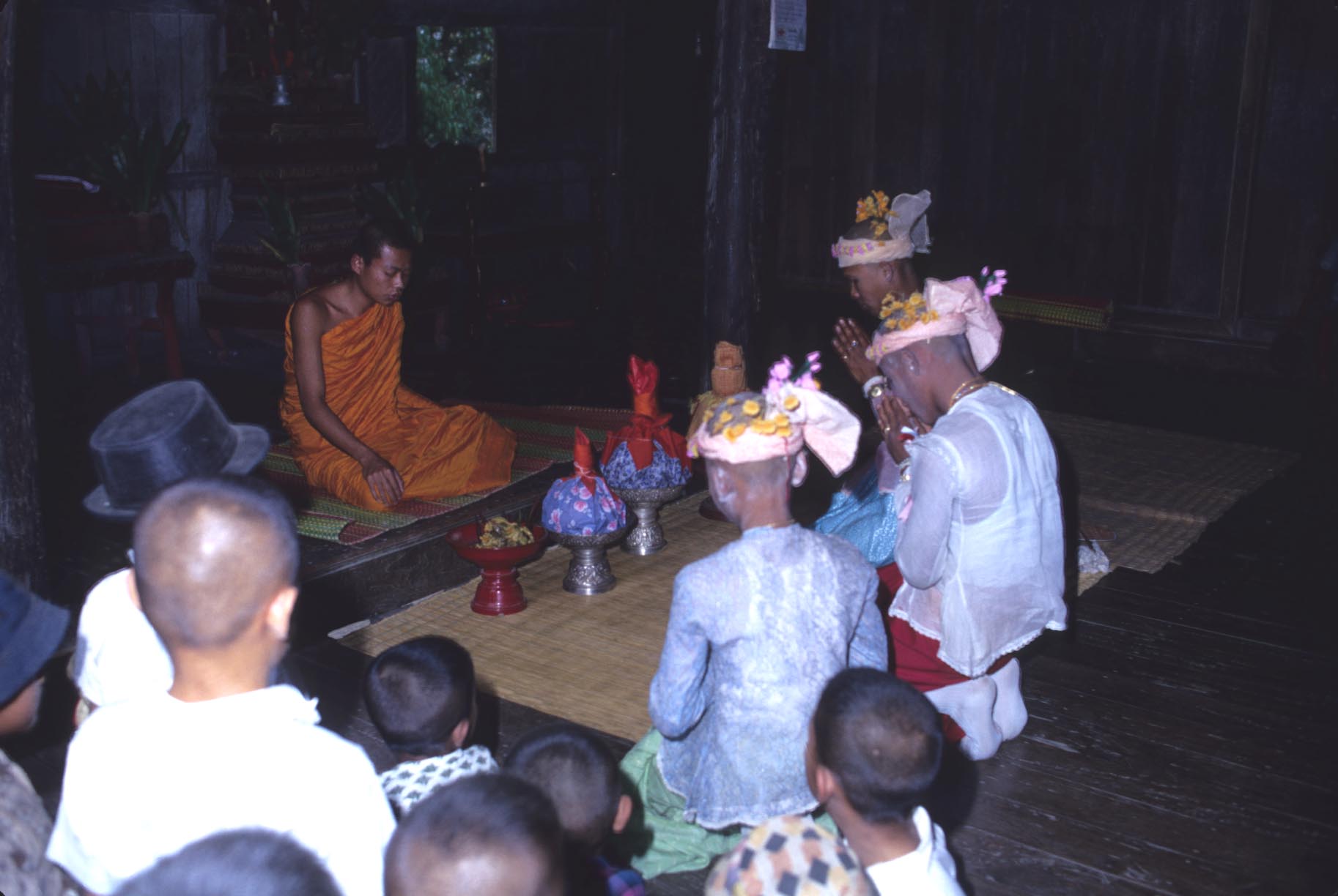 Ordination: candidates (lūk kāēo) asking monk's blessing, 2 photos, Ban Khapuang, Amphoe Mae Sariang, Changwat Mae Hong Son, Thailand, March 1968