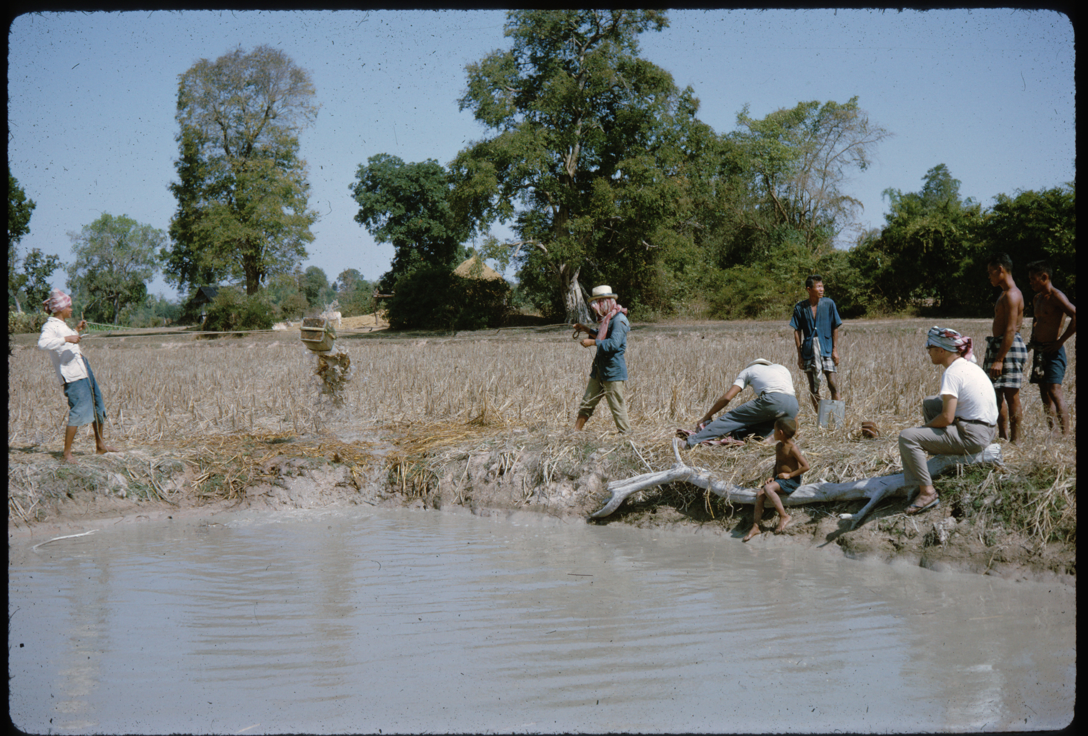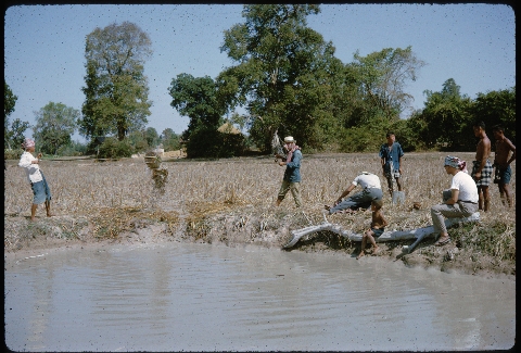 Emptying a pond in a field at beginning of rice field in order to catch the fish, Ban Nong Tun, A. Muang, Changwat Maha Sarakham, 1963 or 1964