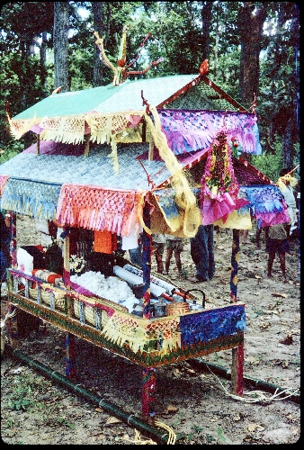 Kathin container for communal bun kathin -- rite to offer robes to clergy after the end of Buddhist lent -- sponsored by villagers for wat in neighboring village, Ban Nong Tun, A. Muang, Changwat Maha Sarakham, 1963 or 1964