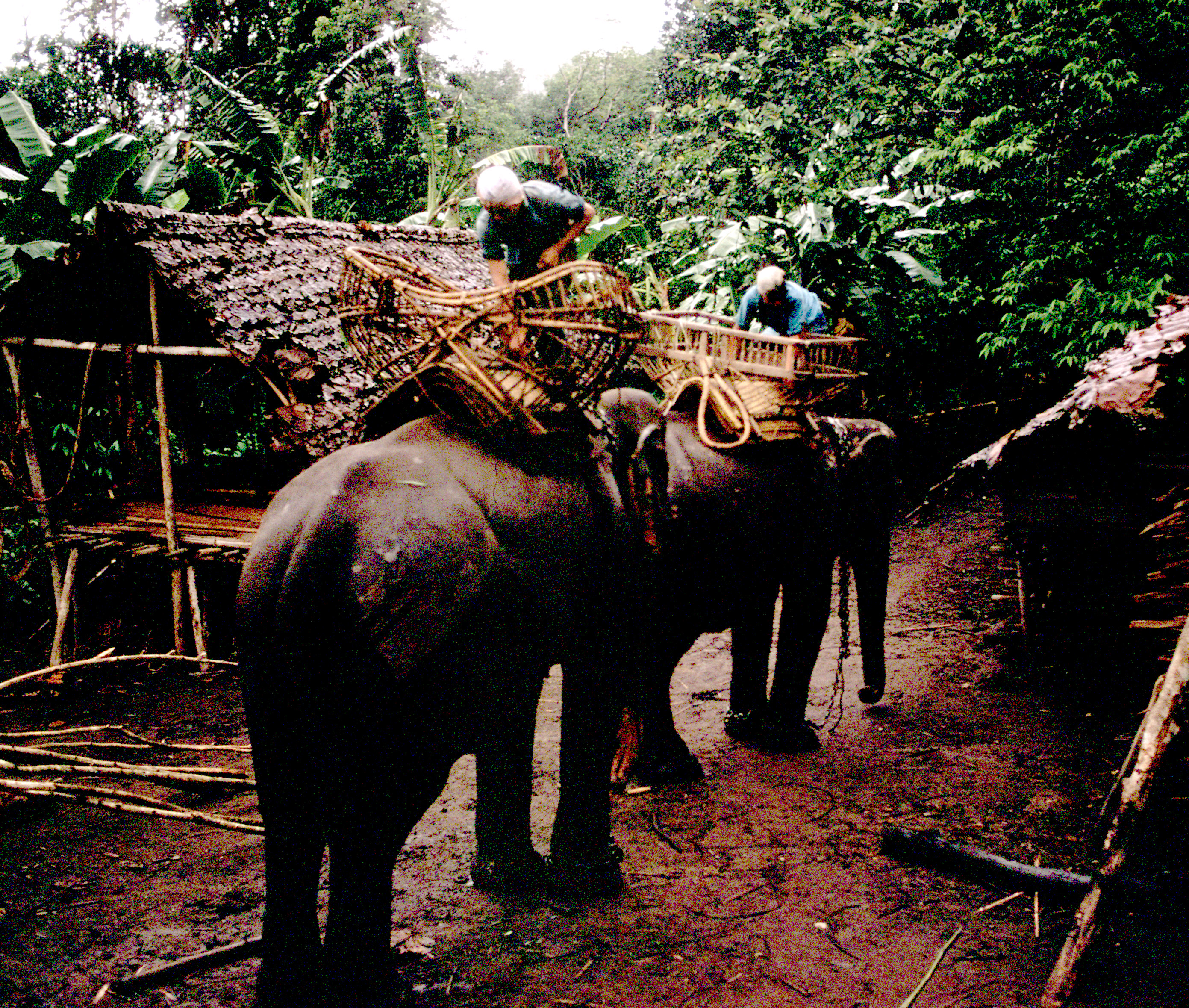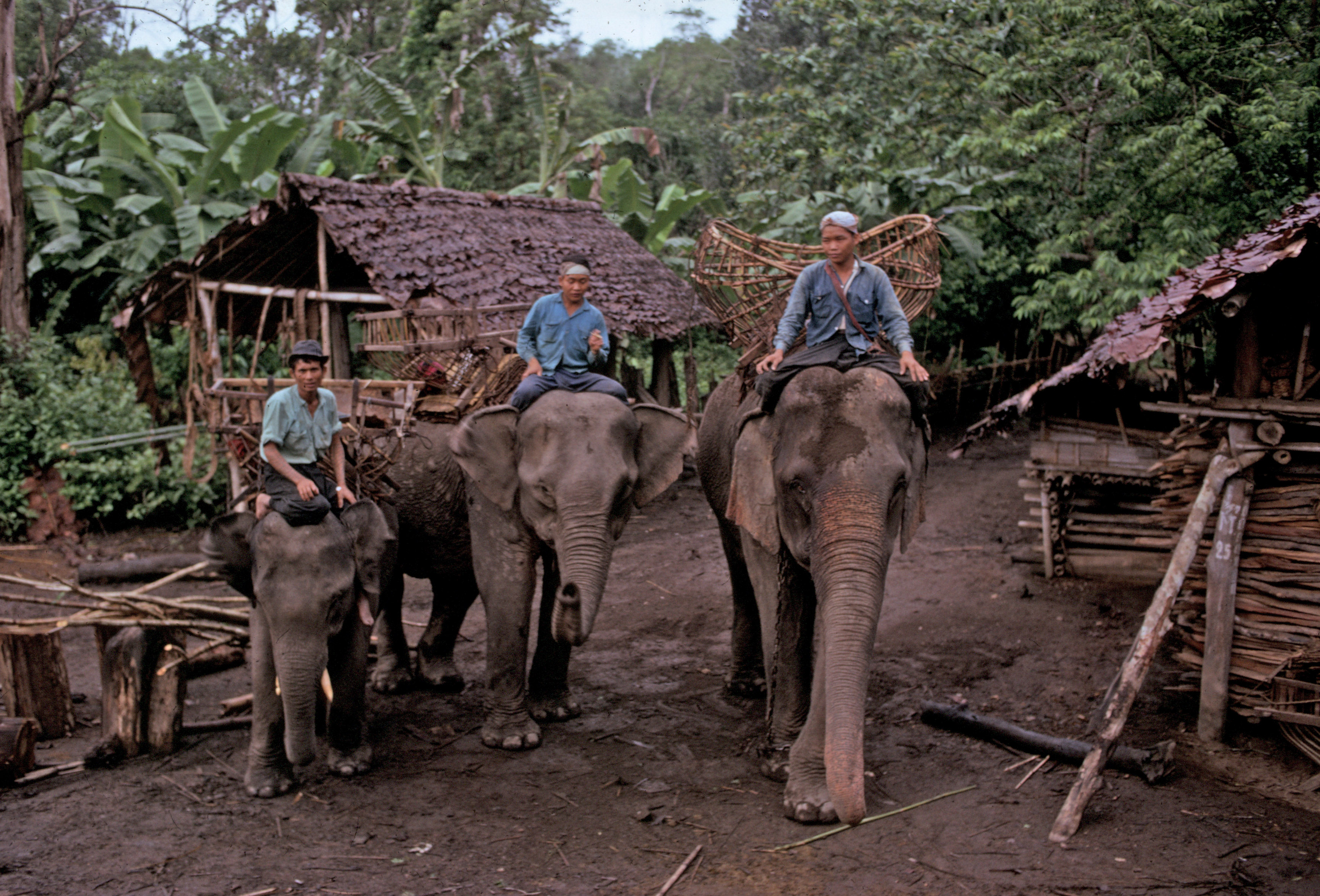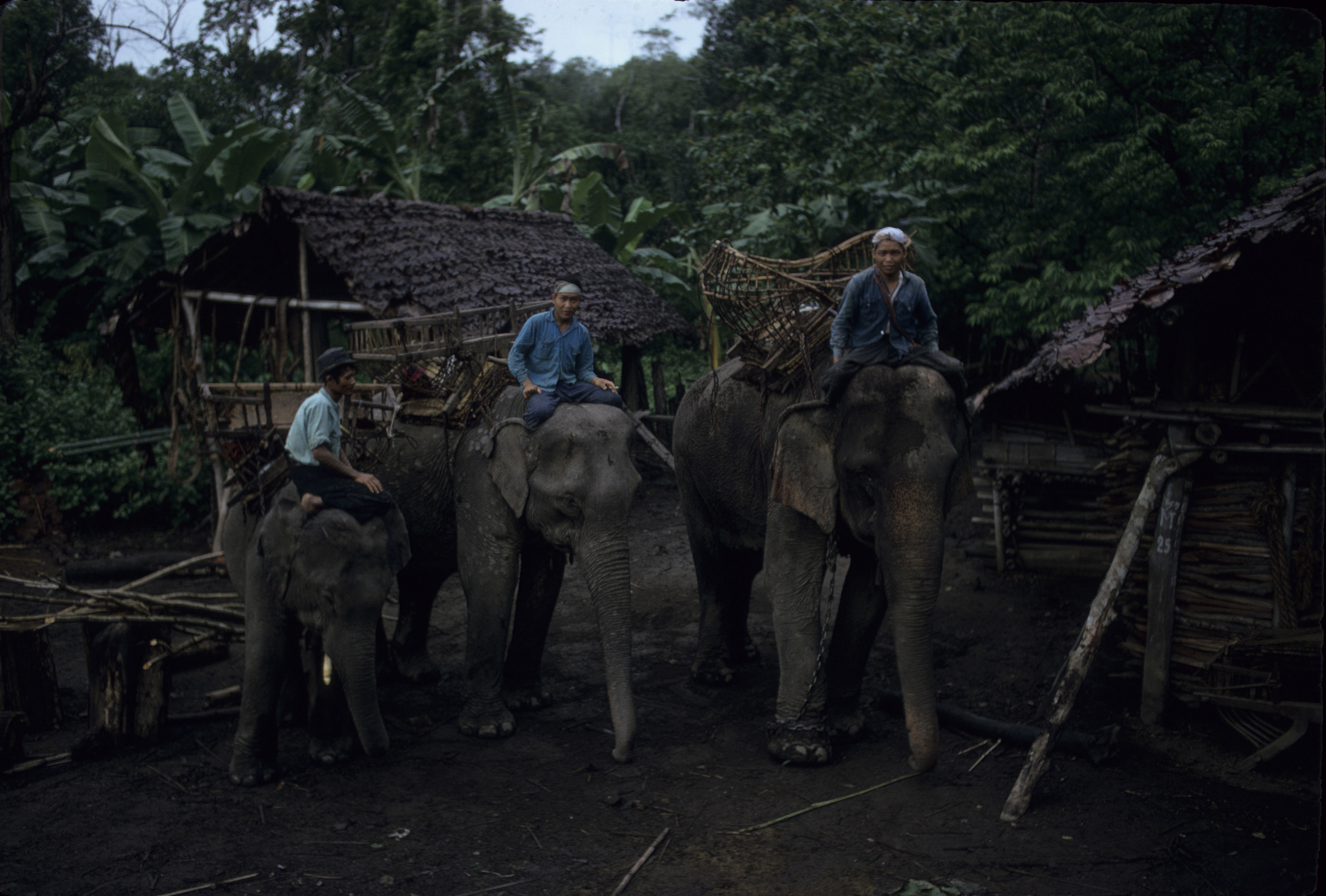 Trip to Salween to find old palm leaf manuscripts (bailān) -- elephants and mahouts from Bān Khun Māē Tôp, 4 photos, Thambon Ban Kat, Amphoe Mae Sariang, Changwat Mae Hong Son, Thailand, June 1968