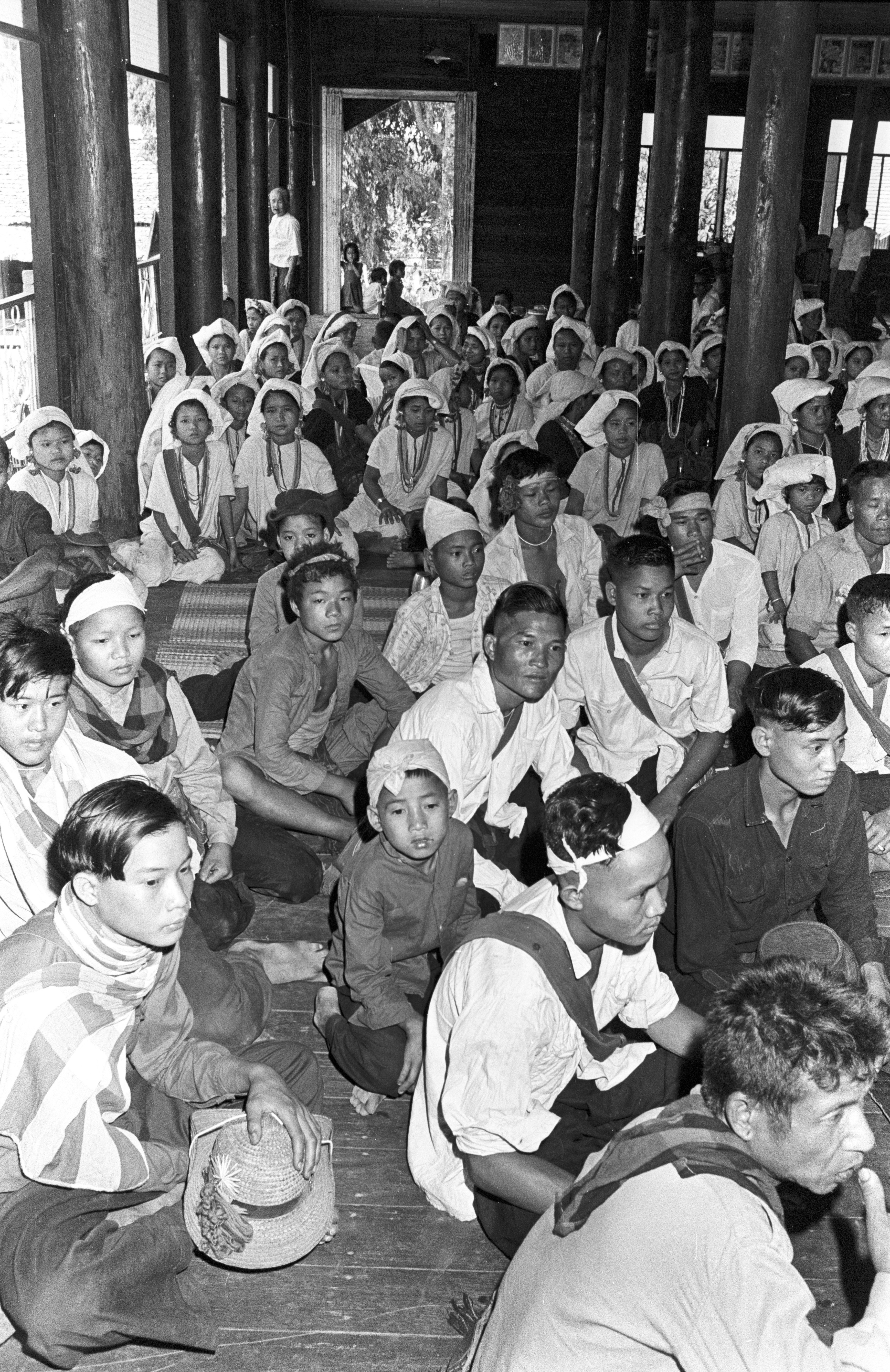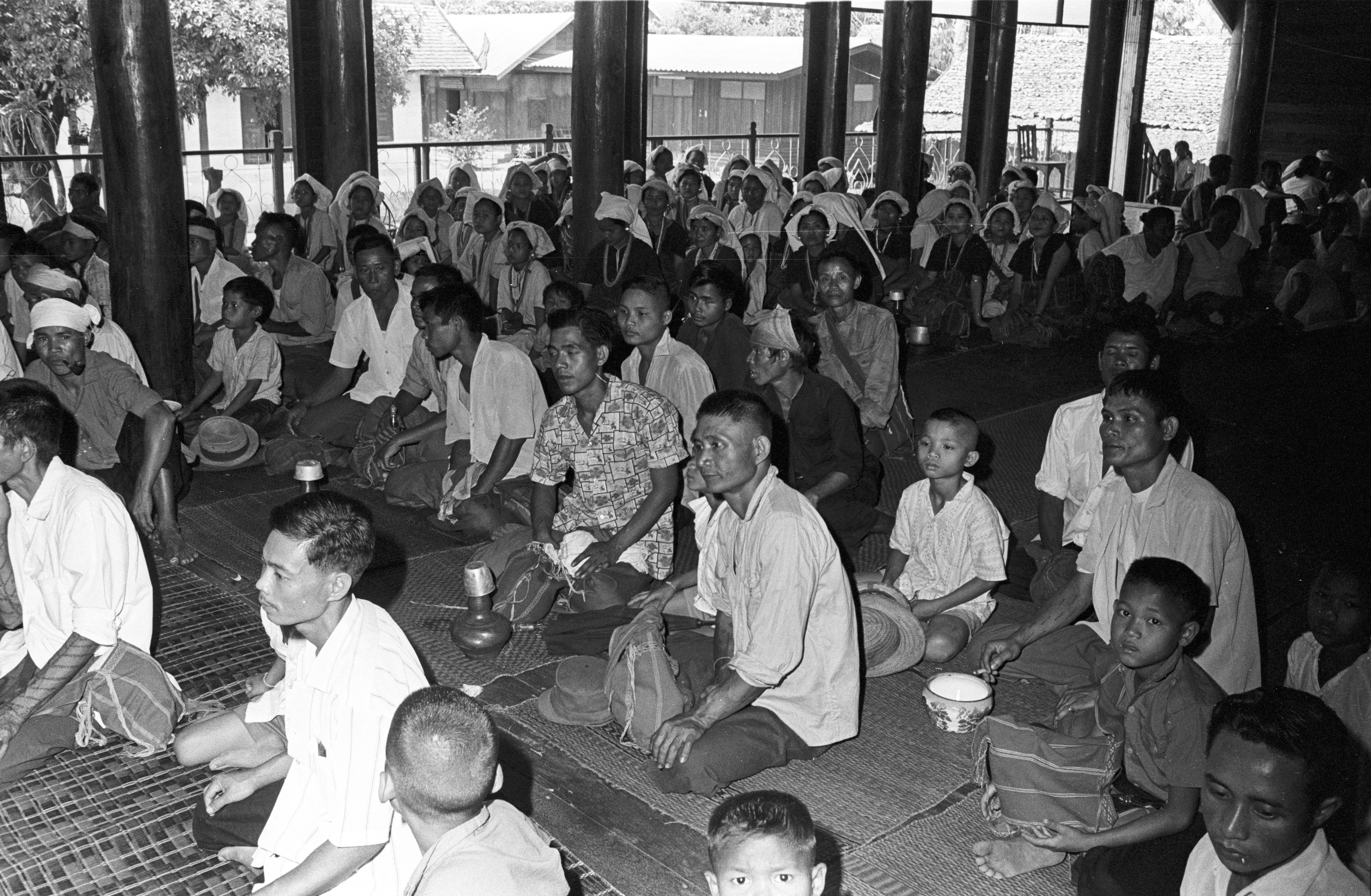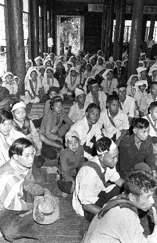 Wat Kittiwong: Sgaw Karen making offerings for Songkran, 2 photos, Amphoe Mae Sariang, Changwat Mae Hong Son, Thailand, April 1968