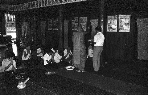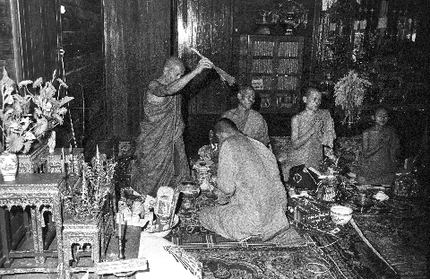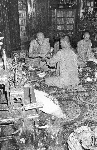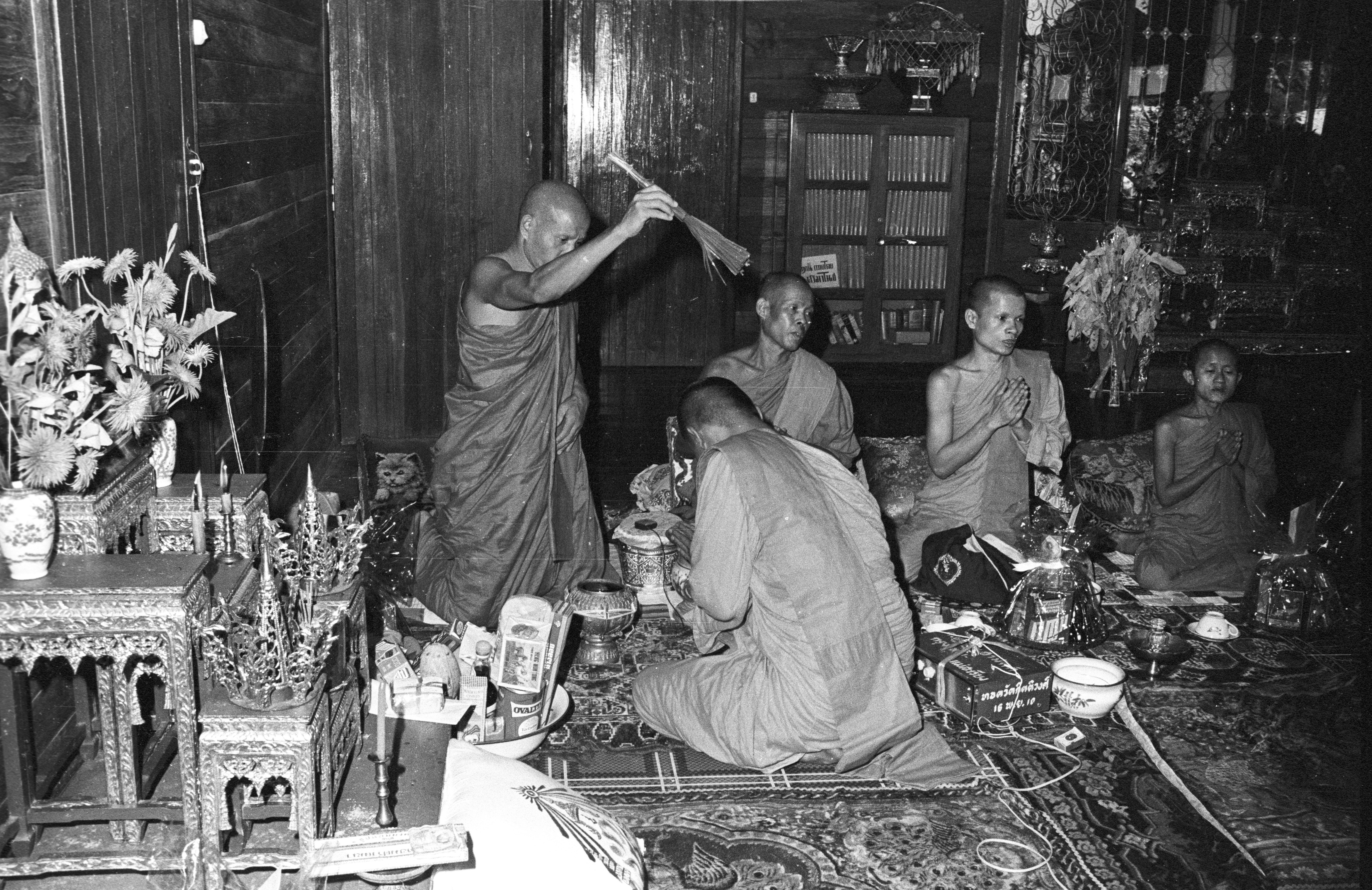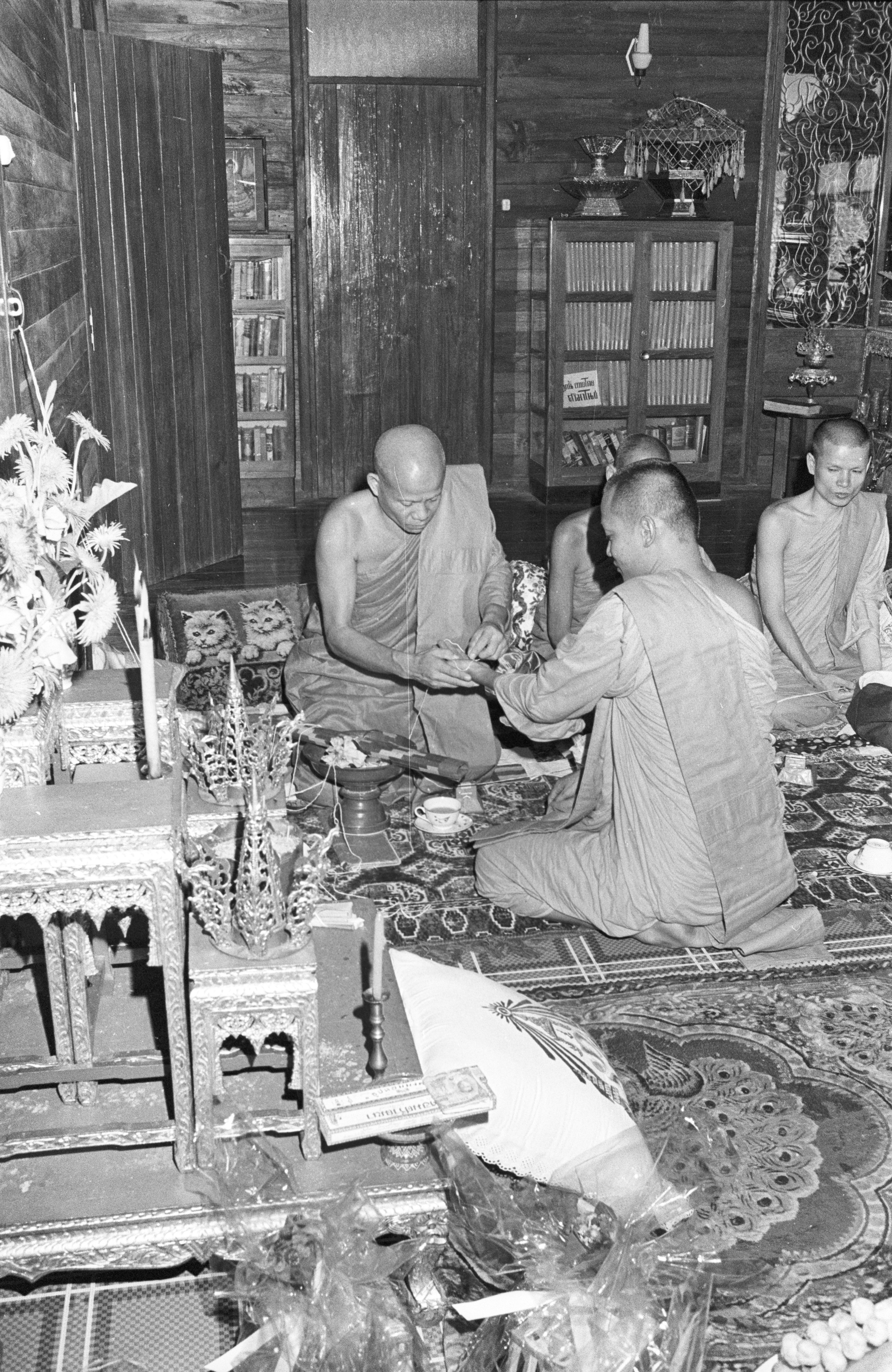 Wat Kittiwong: 'Extending fate' rite (süp chātā สืบชาตา) for Čao Khana Amphoe: senior monk tying Čao Khana Amphoe's wrists, 2 photos; senior monk sprinkling holy water on Čao Khana Amphoe, 2 photos, Amphoe Mae Sariang, Changwat Mae Hong Son, Thailand, September 1968