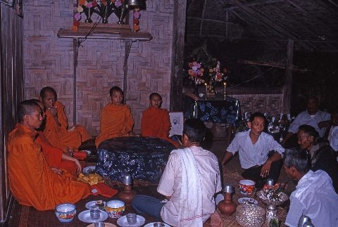 Pôi Khao Sang (rite of offering house and goods to make merit for a deceased person) – monks inside the house, 2 photos, Amphoe Mae Sariang, Changwat Mae Hong Son, Thailand, March 1968