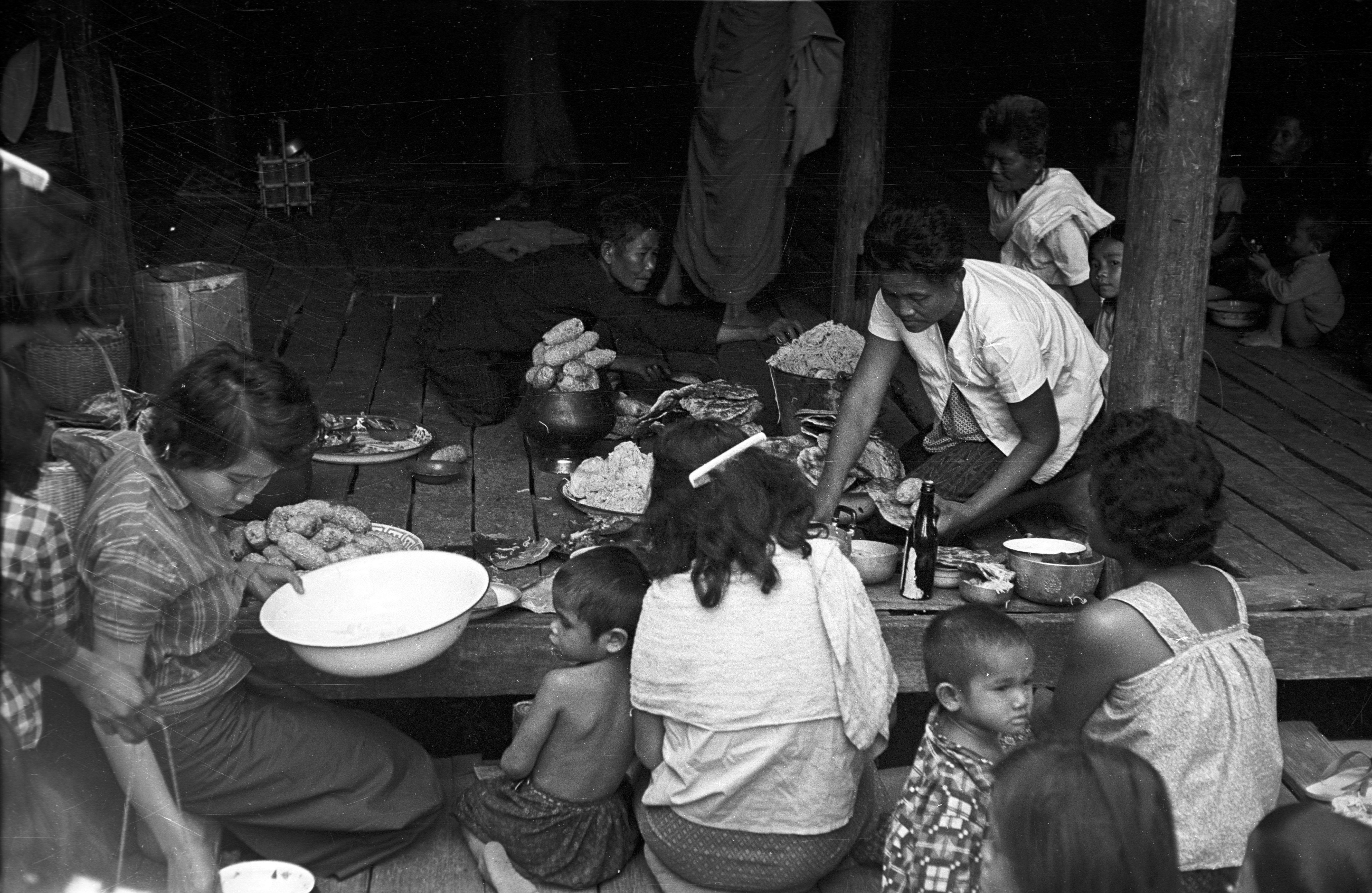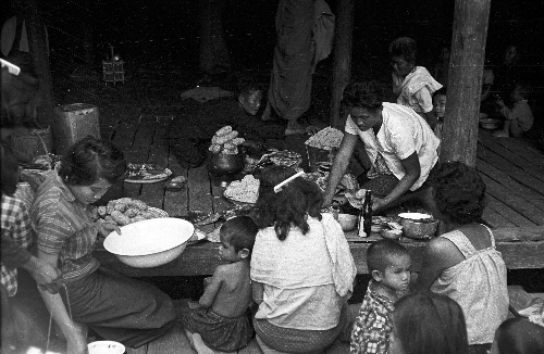 Arranging food at monks’ residence at wat for bun khāo cī (บุญข้าวจี่) ritual, Changwat Maha Sarakham, Thailand, February 1964