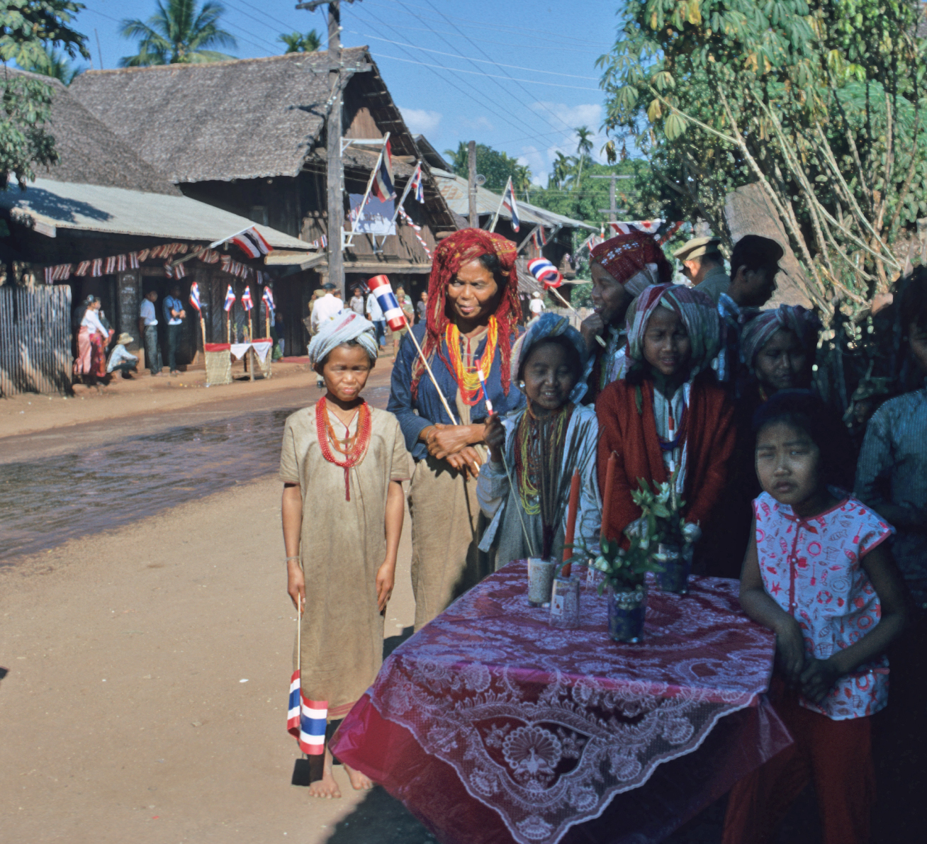 Karen preparing to receive King, Amphoe Muang Mae Hong Son, Changwat Mae Hong Son, Thailand, January 1968