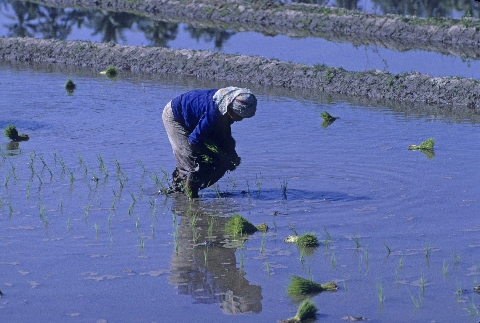 Rice planting late in the day with close-up sideview of woman, Amphoe Mae Sariang, Changwat Mae Hong Son, Thailand, February 1968