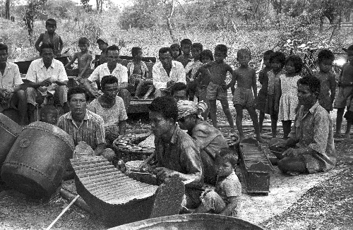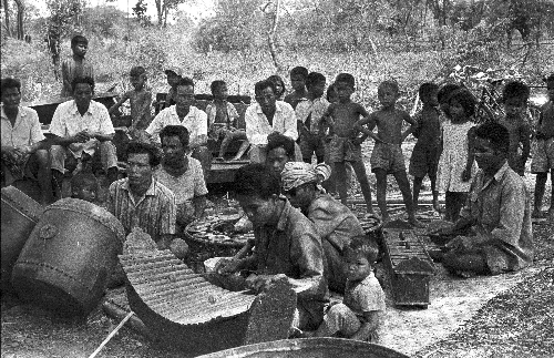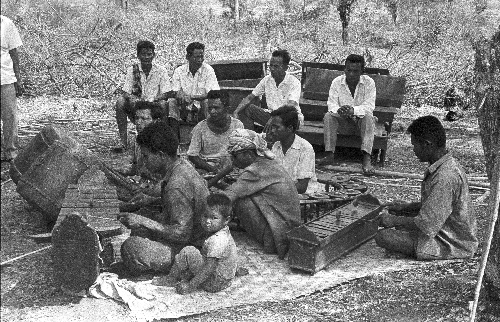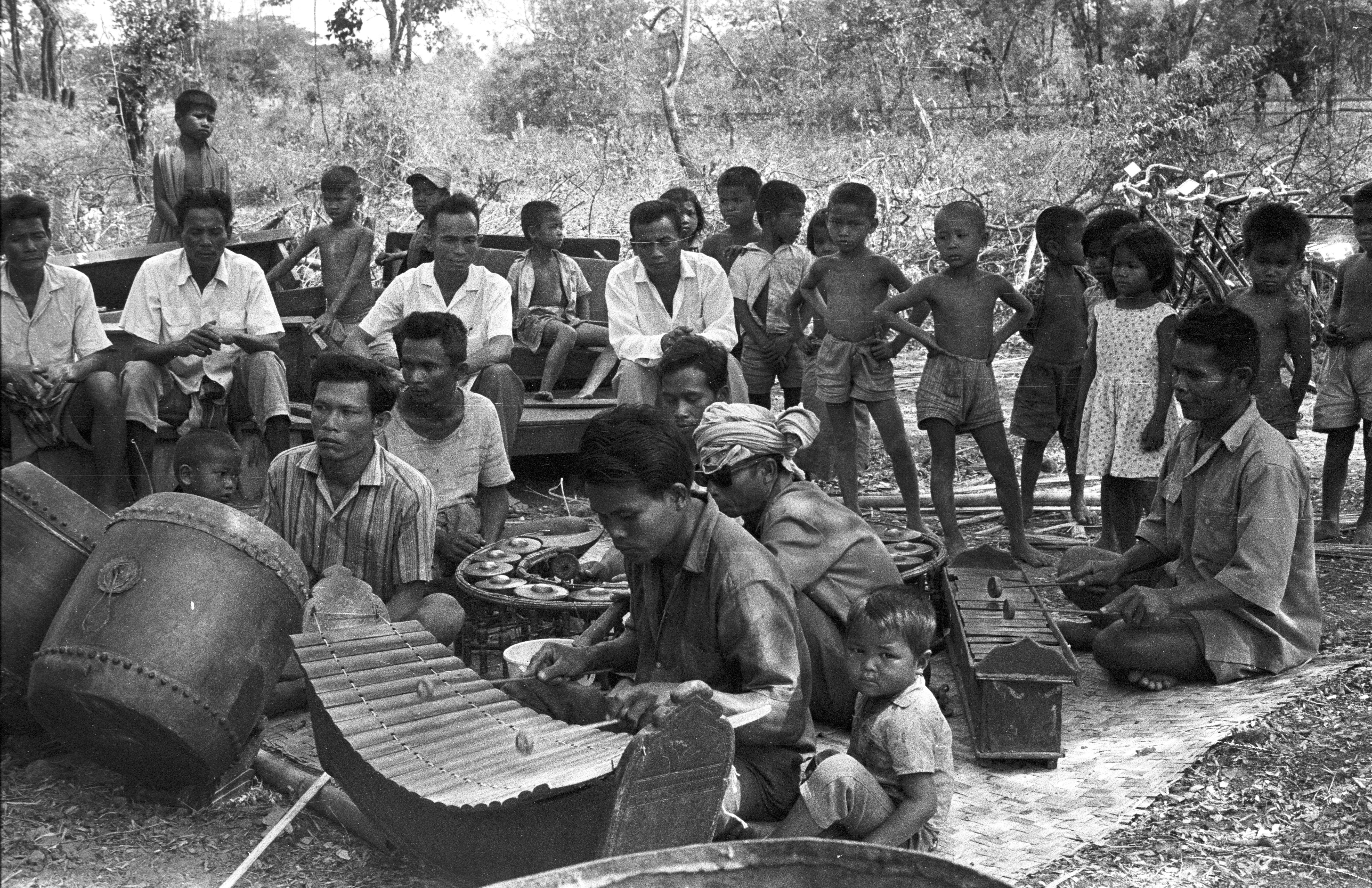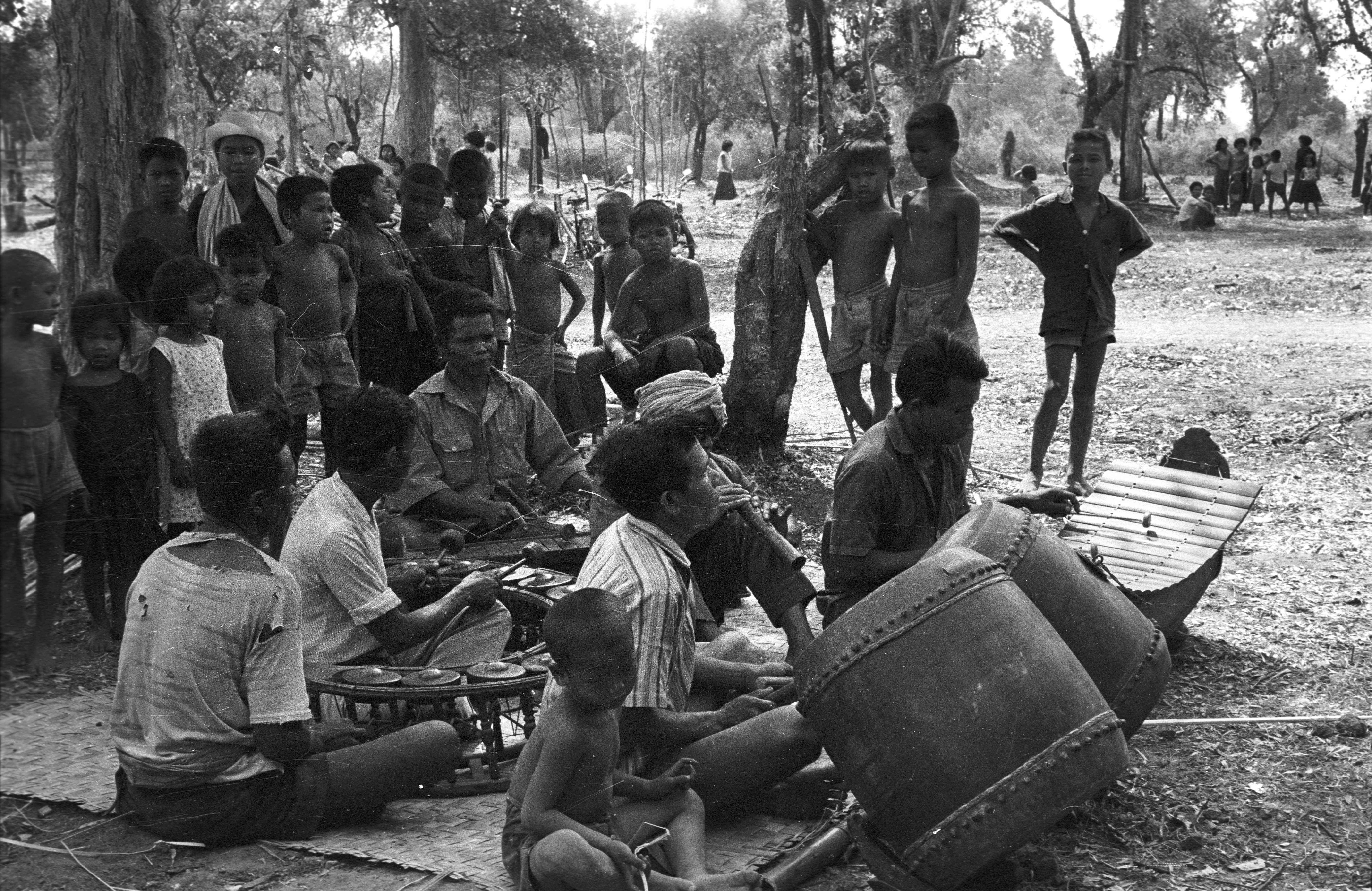 Traditional orchestra at ceremony of lāng pā chā (ล้างป่าช้า), ‘cleansing a cemetery’, 4 photos, Changwat Sara Buri, Thailand, February 1964