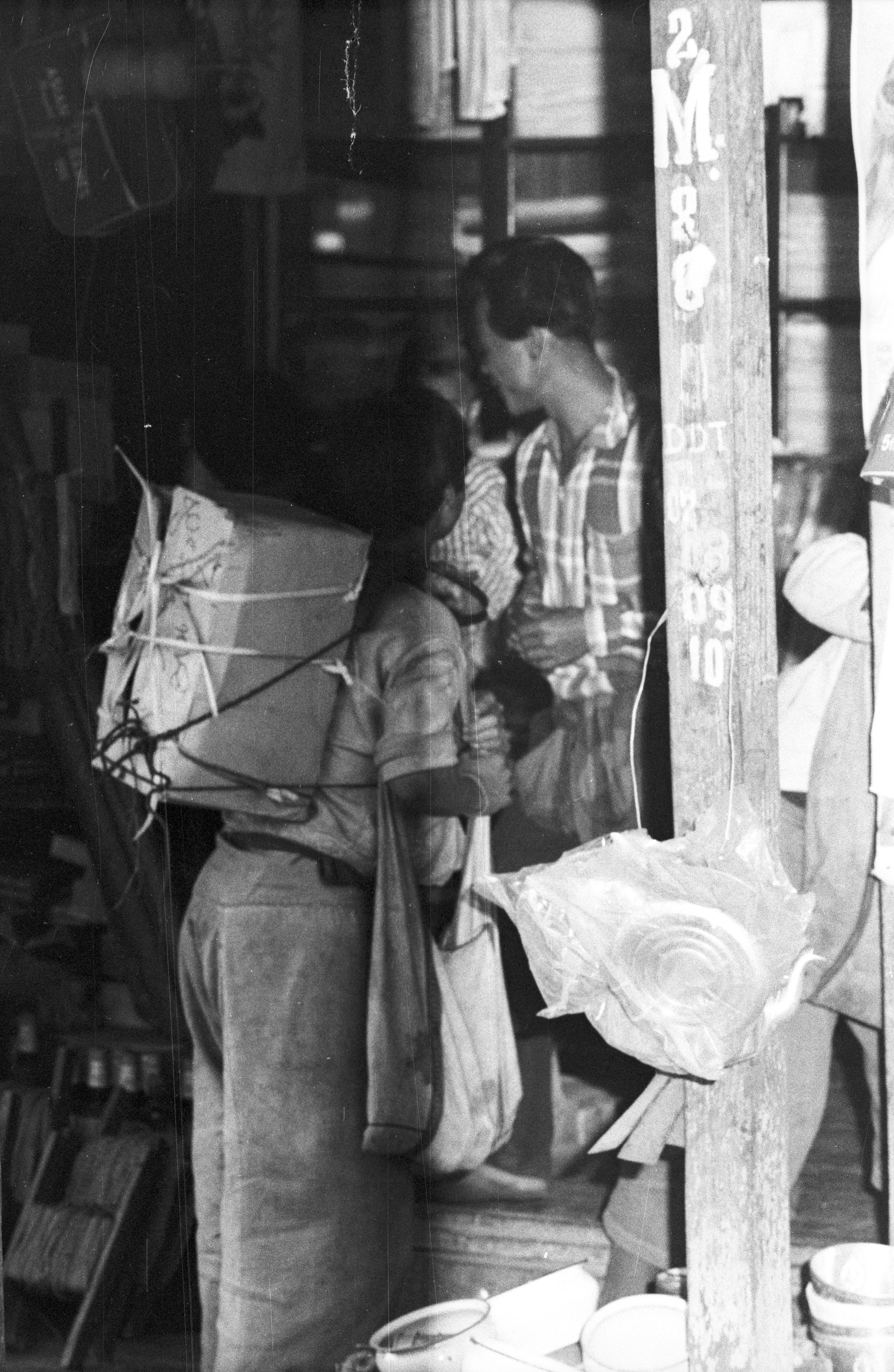 Karen woman buying from shop, Amphoe Mae Sariang, Changwat Mae Hong Son, Thailand, February 1968