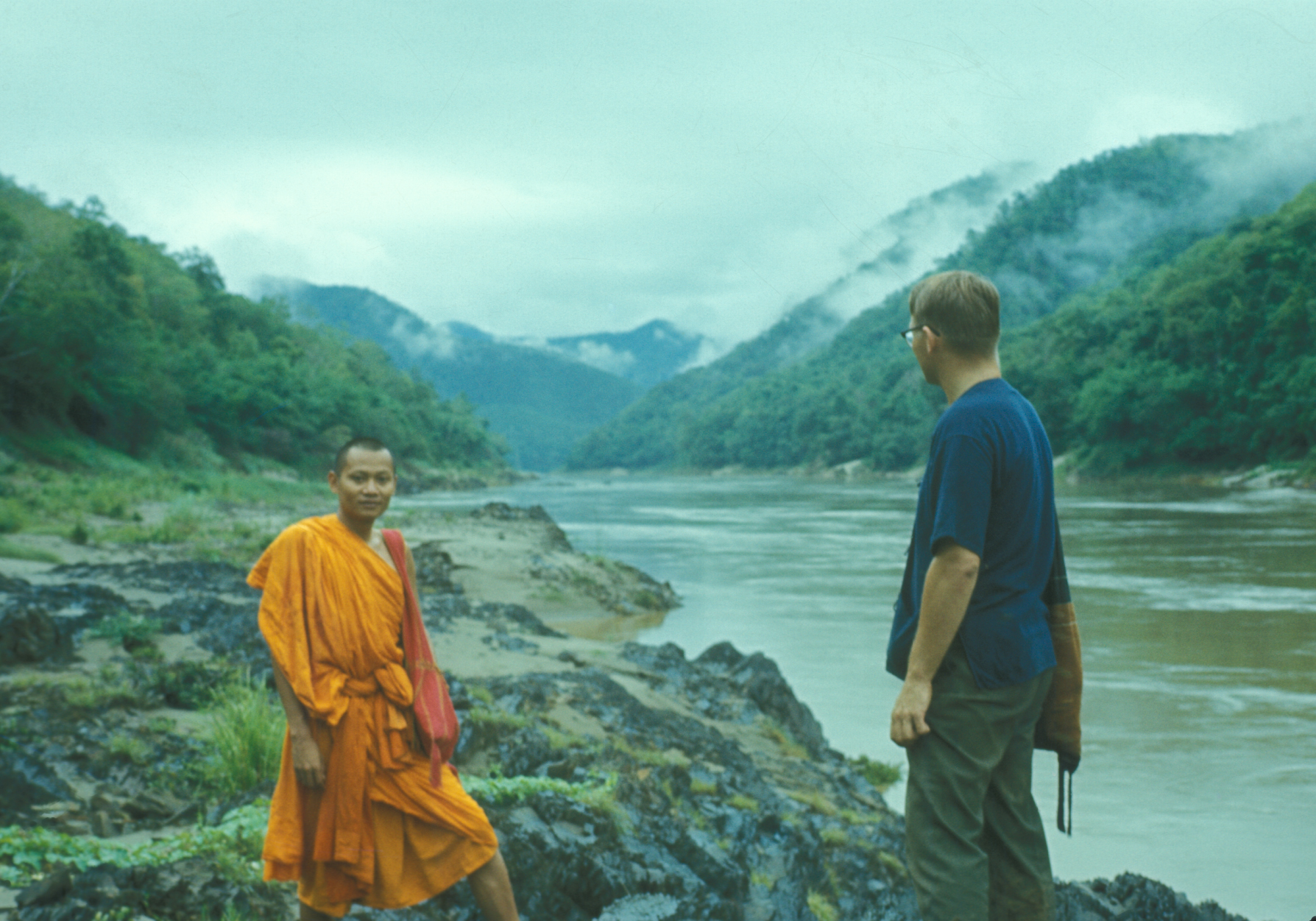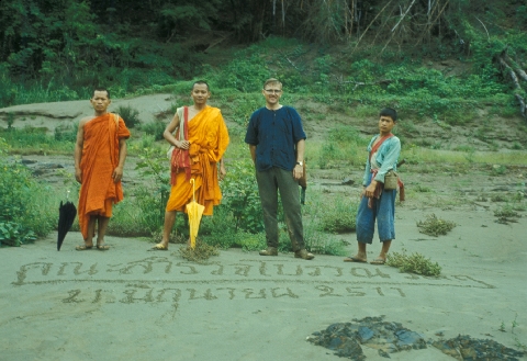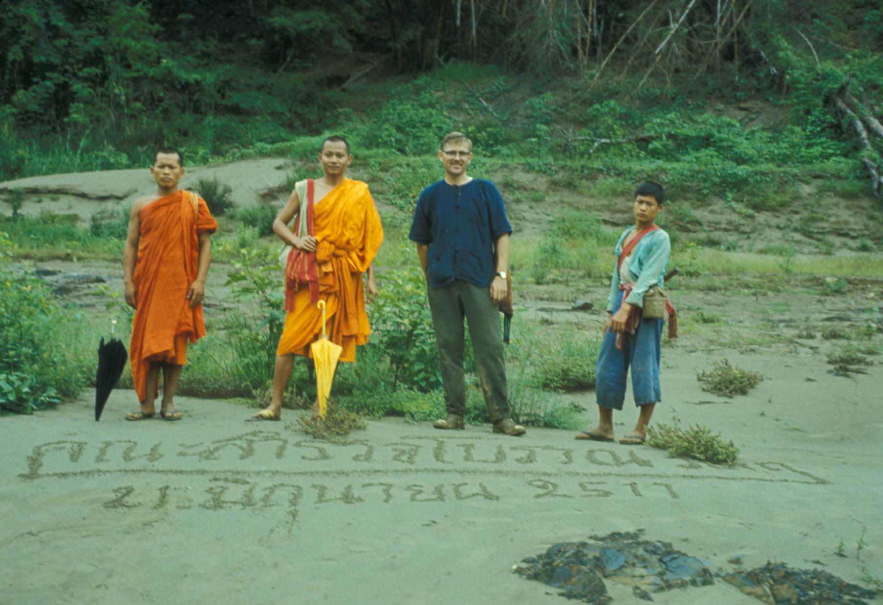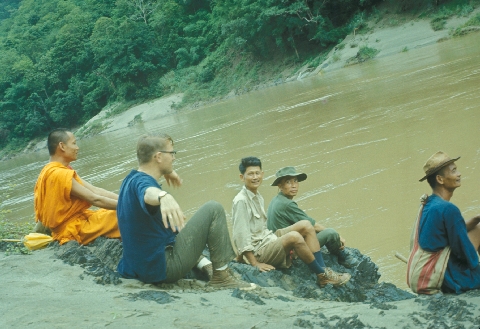 Trip to Salween to find old palm leaf manuscripts (bailān) -- Biff (Charles F. Keyes) and Cao Khana Amphoe on bank of Salween, group on bank of Salween, group on bank of Salween --with inscription in the sand, 3 photos, Nam Mae Ngae, Amphoe Mae Sariang, Changwat Mae Hong Son, Thailand, June 1968