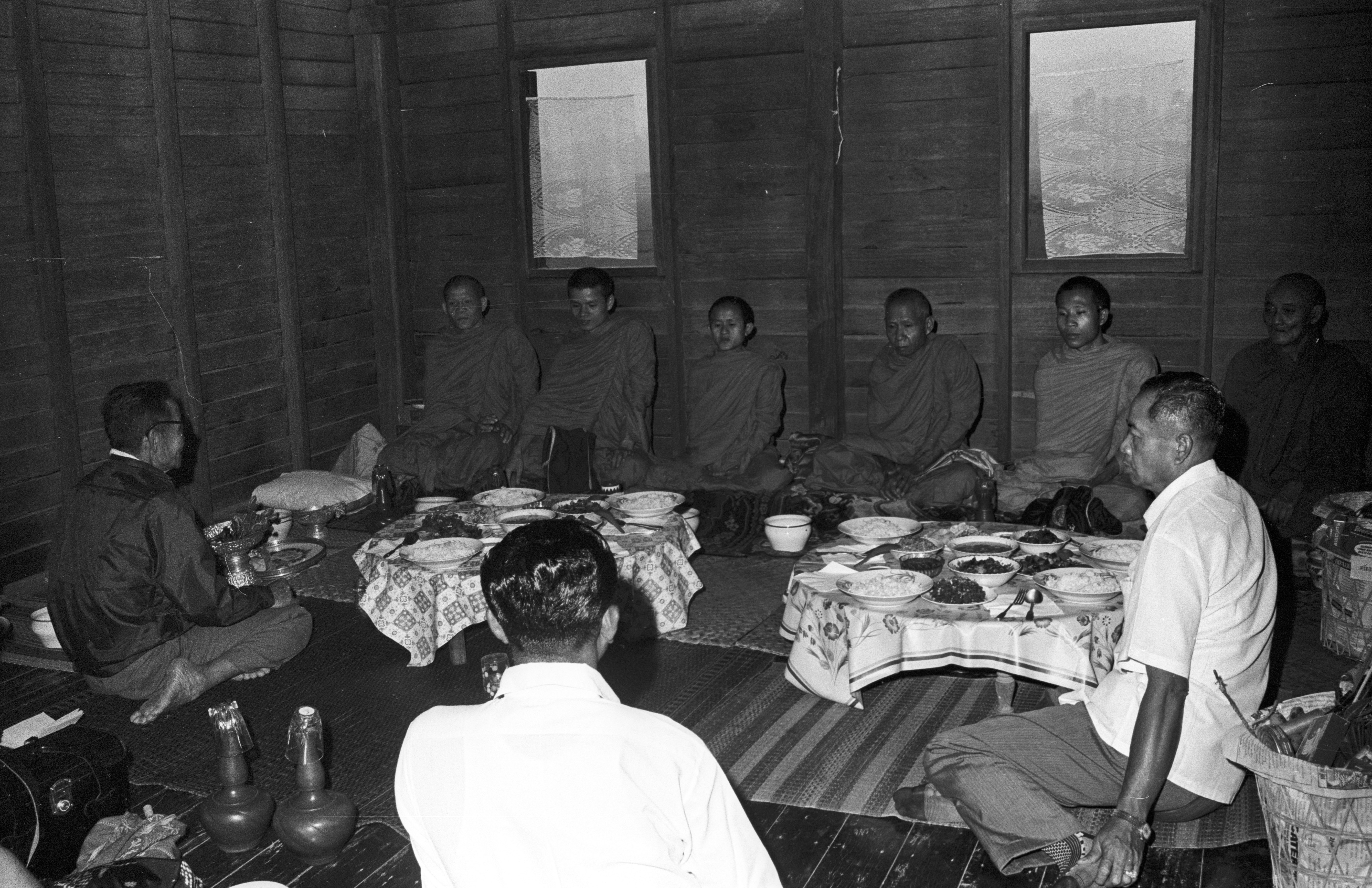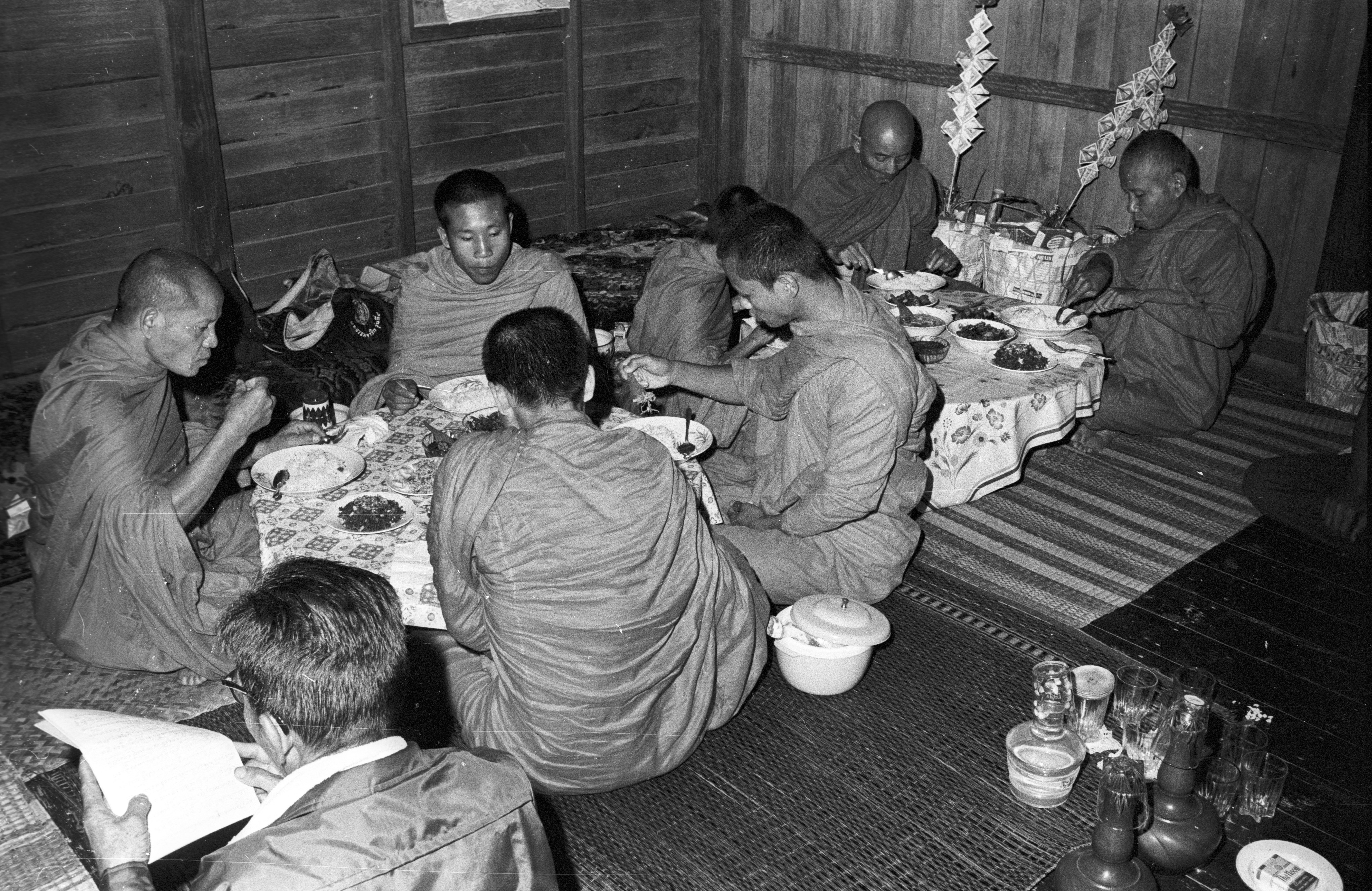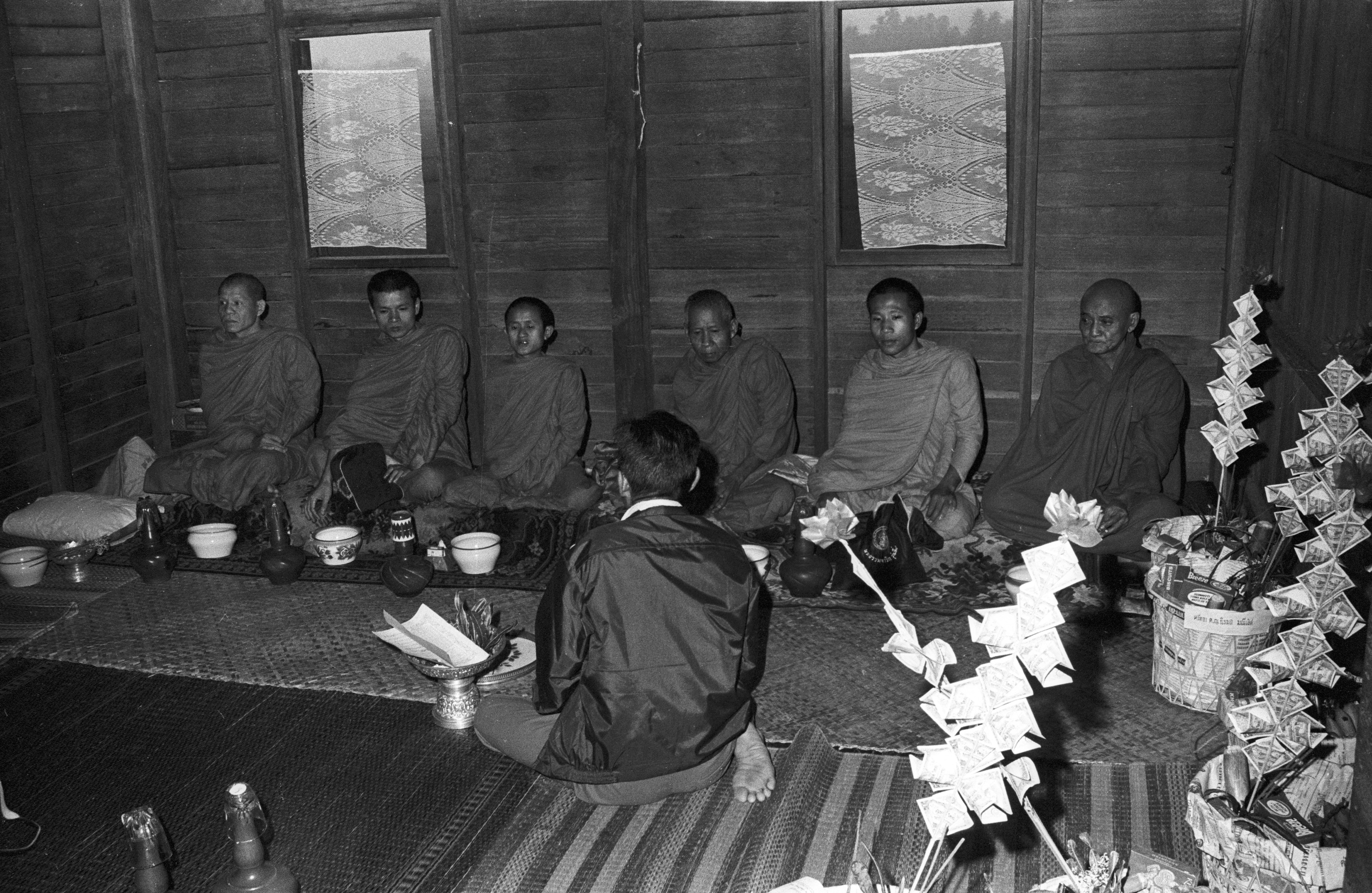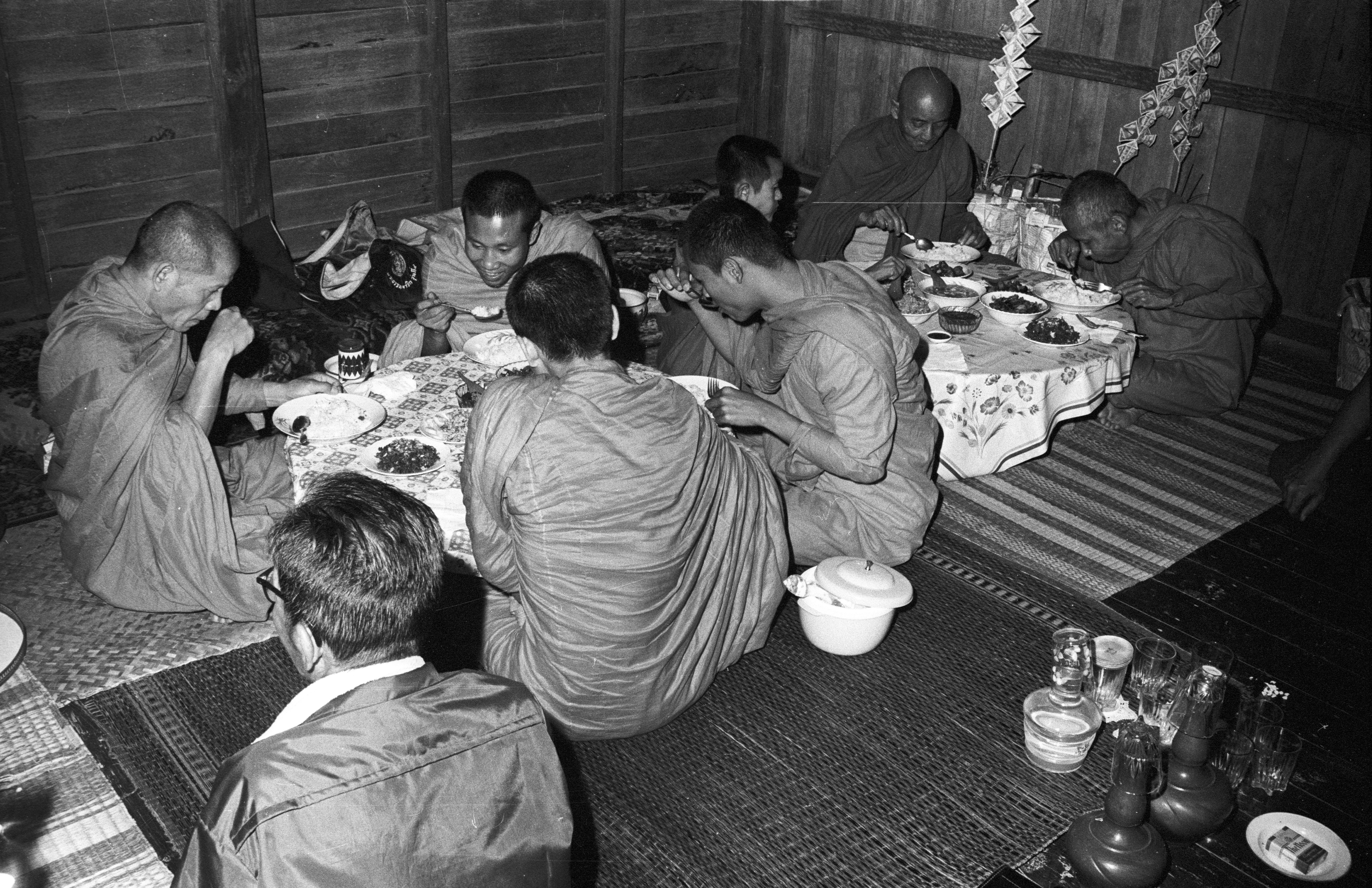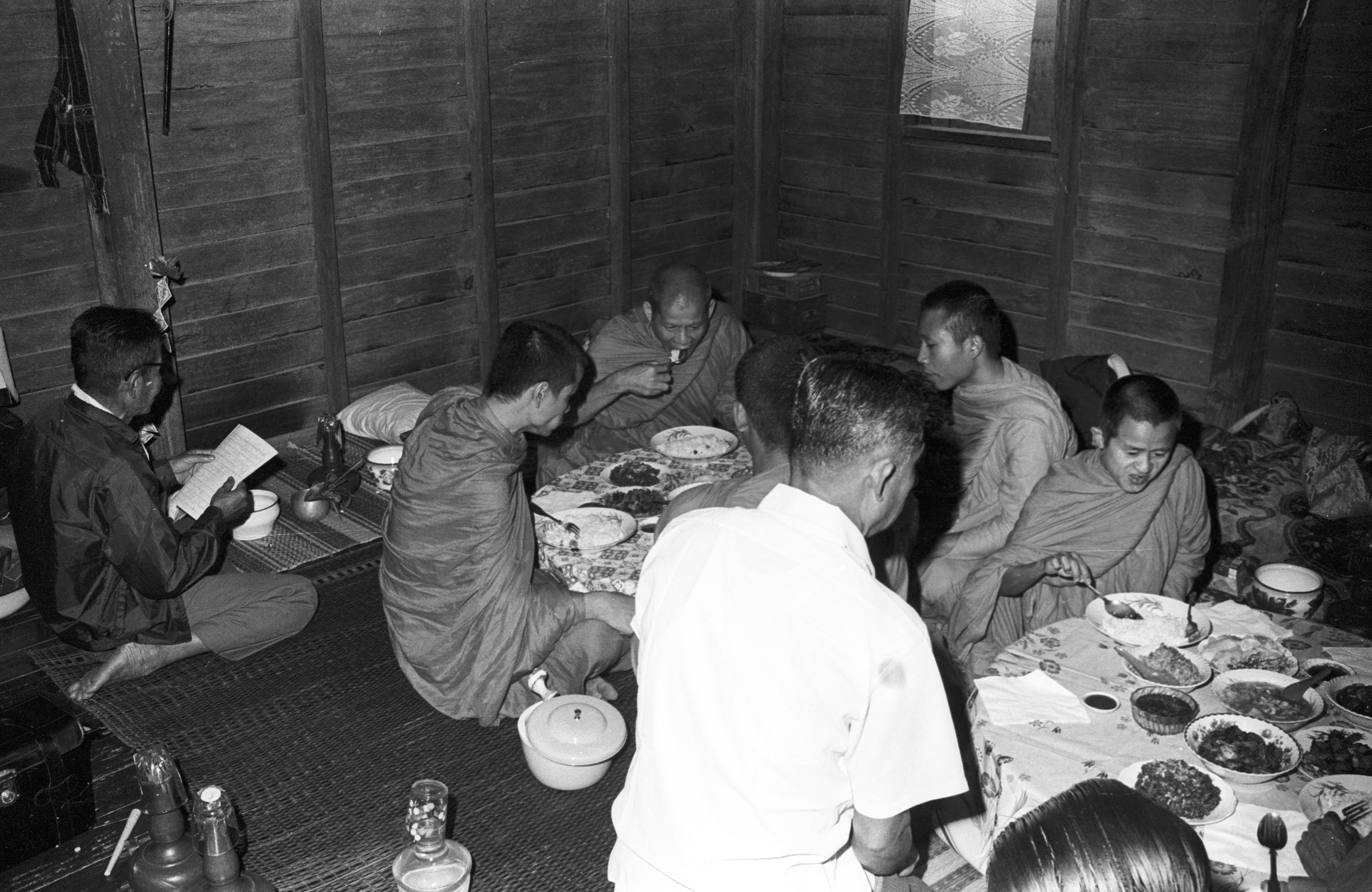 Pôi Khao Sang (rite of offering house and goods to make merit for a deceased person): monks receiving food alms, 5 photos, Amphoe Mae Sariang, Changwat Mae Hong Son, Thailand, March 1968