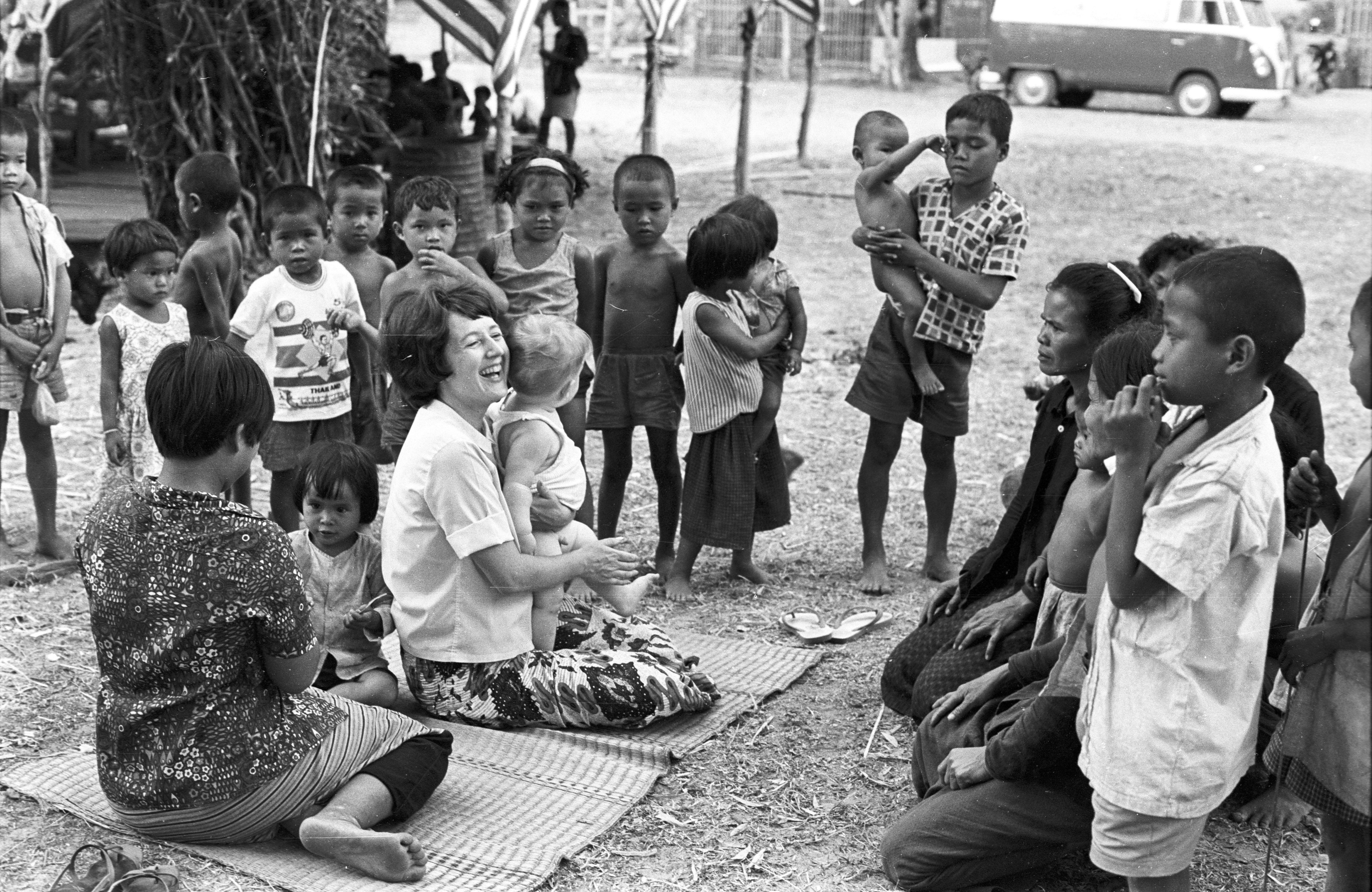 Maeo, Jane and Nick Keyes sitting out on the mat with villagers, Maha Sarakham Province, Thailand, November 1967