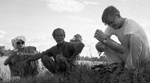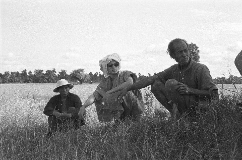 Village man, headmonk (perhaps his son), other man (his son or son-in-law) in field after harvesting, 2 photos, Ban Nong Tun, Amphoe Muang, Changwat Maha Sarakham, Thailand, December 1963