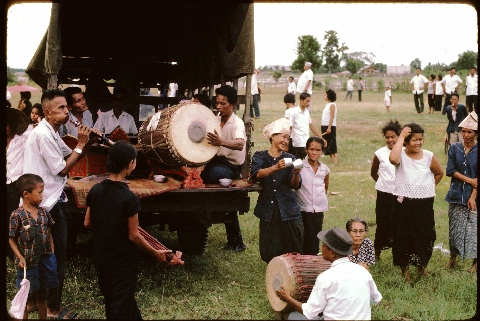 Funeral of old woman -- Musicians at funeral, Changwat Chiang Mai, Thailand, August 1967
