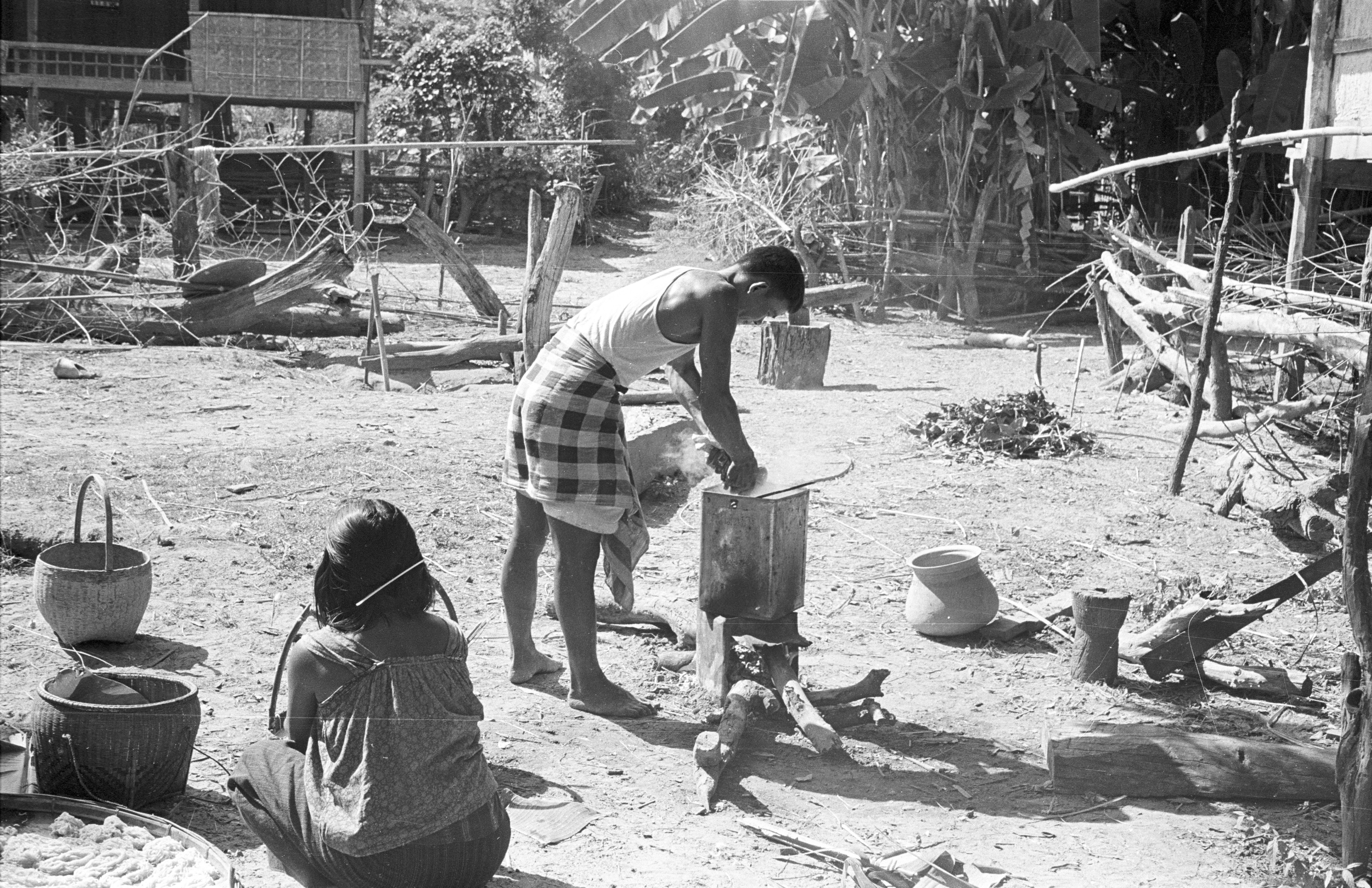Village man preparing boiling water for making rice noodles (khao phūn), Ban Nong Tun, Amphoe Muang, Changwat Maha Sarakham, Thailand, October 1963
