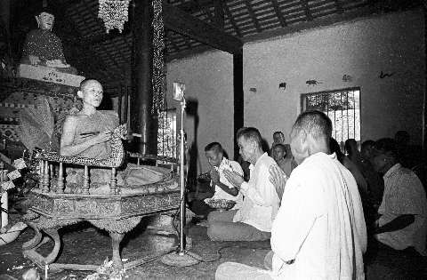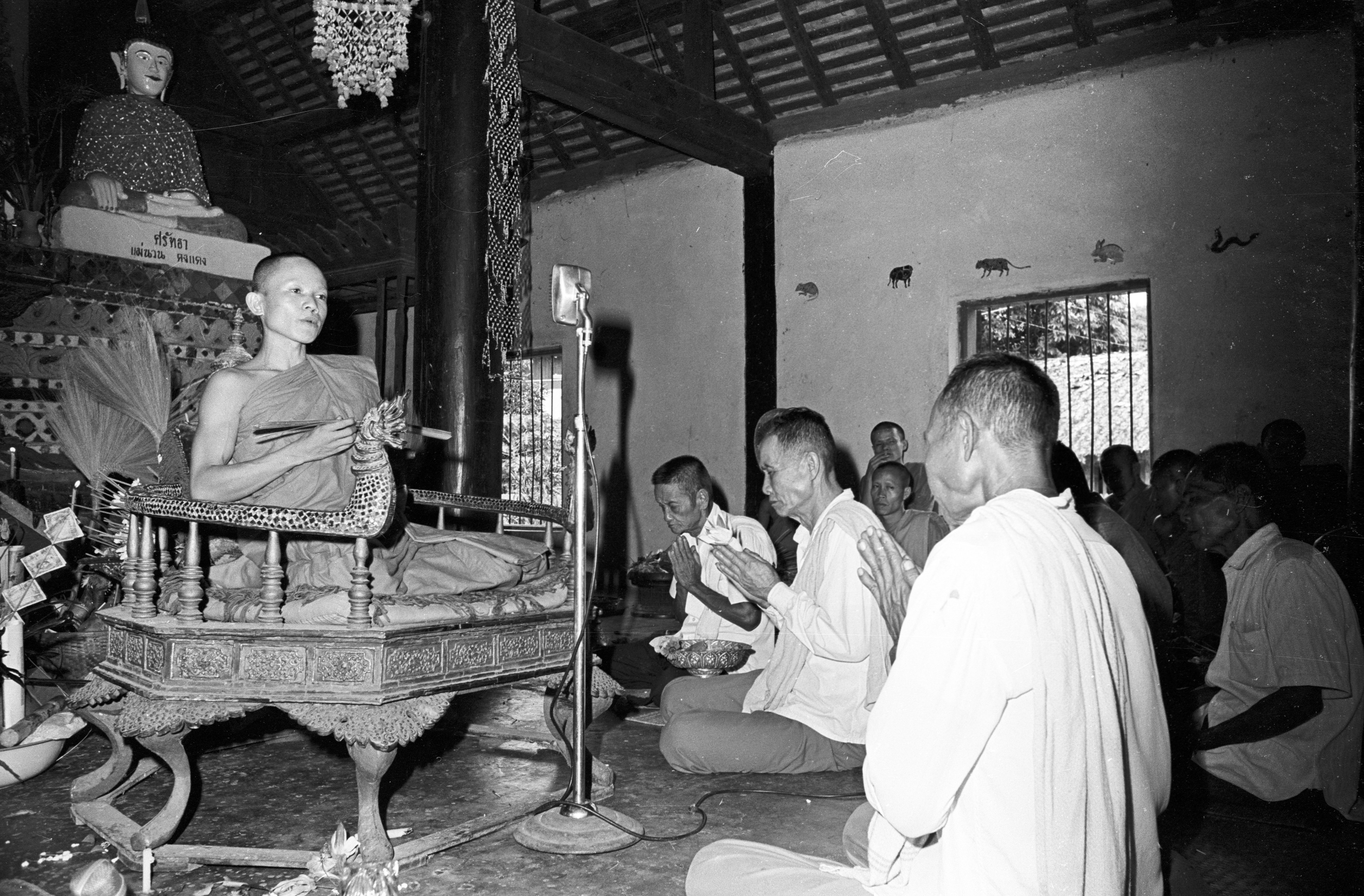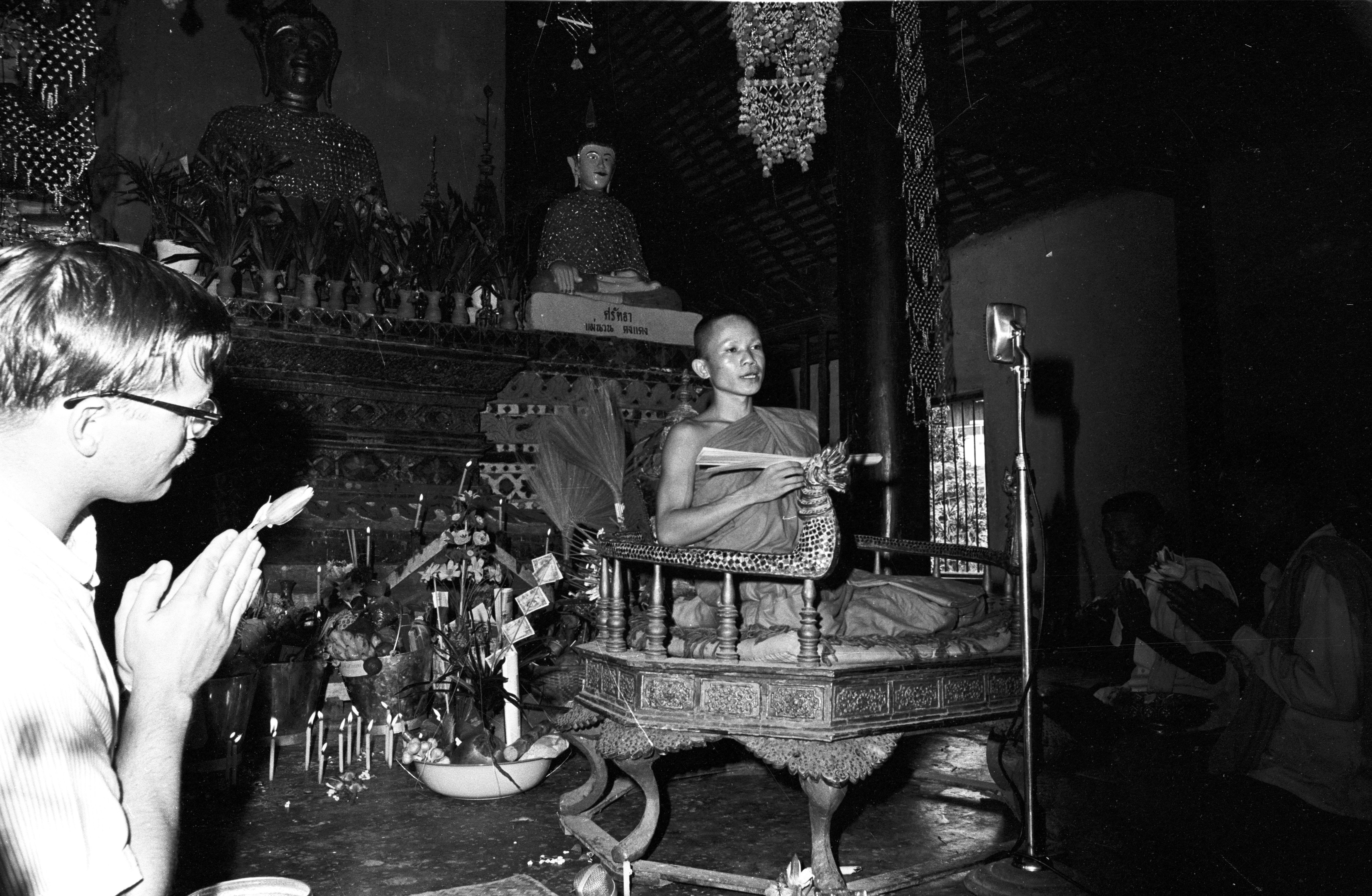 Wat Sitthimongkhon: salākhaphat ceremony, monk reading sermon from bai lan, 3 photos (one with Charles F. Keyes), Mae Hong Son Province, Thailand, September 1967