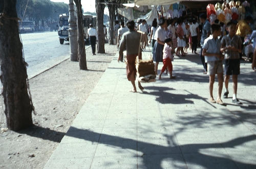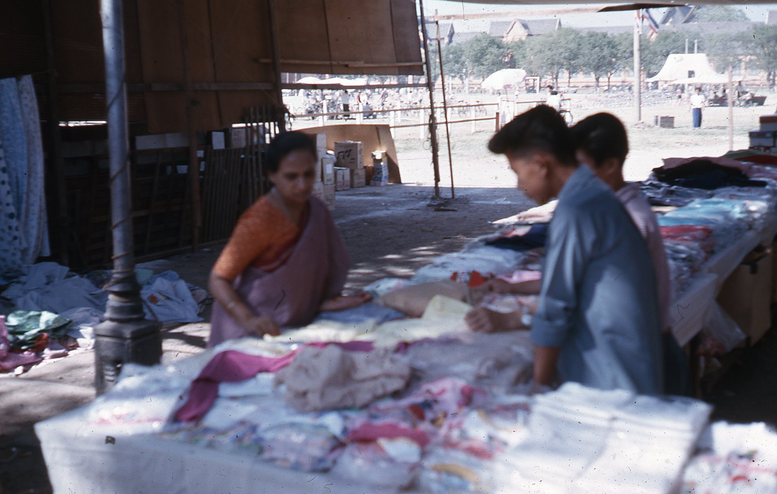 Weekend market at royal grounds (sanam luang) in Bangkok, Indian cloth vendor at weekend market, Thailand, December 1963 (2 photos)