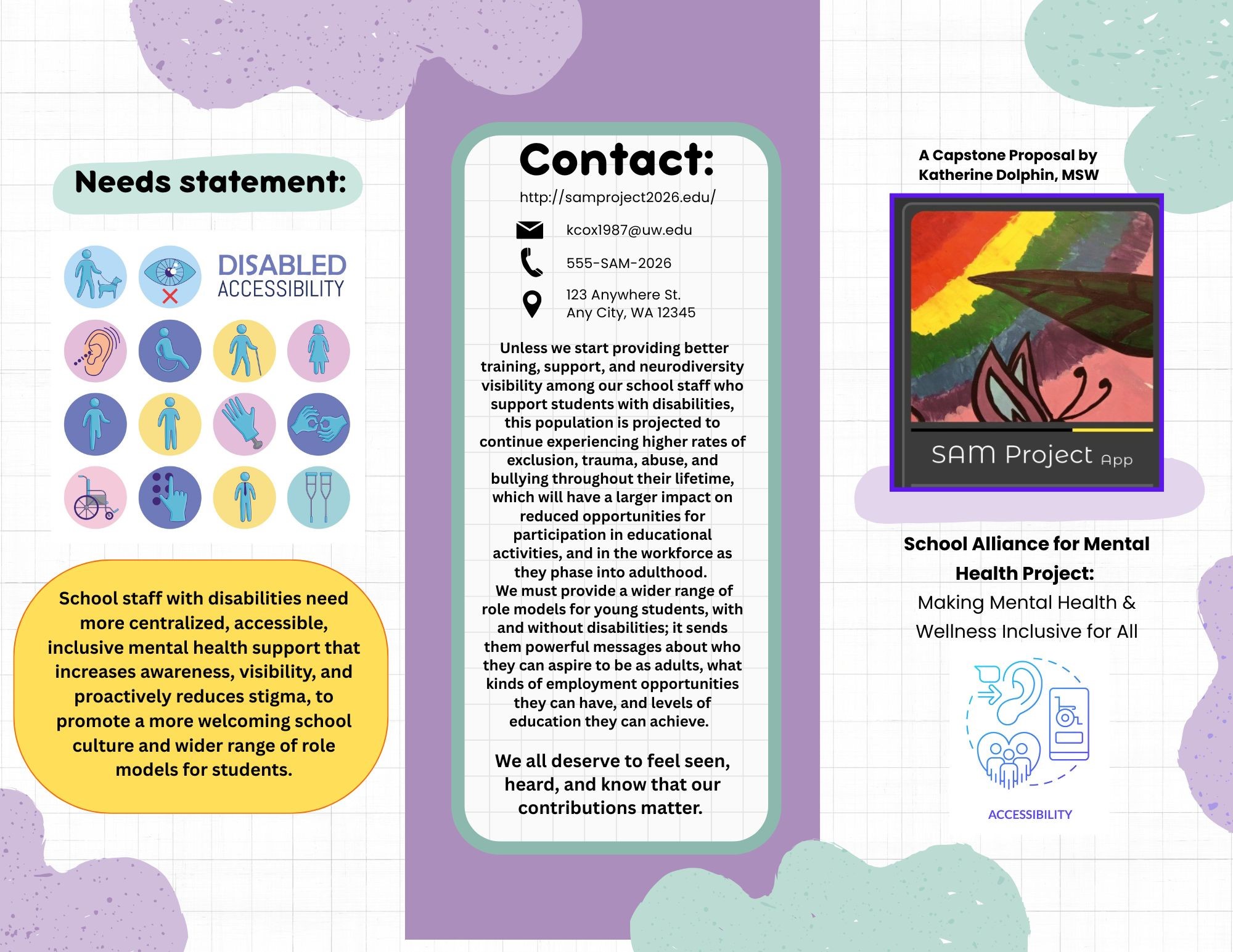 This capstone project offers an idea for how to make mental health and wellness more inclusive to people with disabilities in school settings, with a focus on teachers and school staff. The proposed “Sam Project App” would be designed with accessibility in mind, and incorporate the unique identities of each person with an intersectional, trauma-informed lens to provide specific mental resources that are tailored to the needs of each person. I began by doing a literature review of current research and interventions concerning disabled adult educators; I found there was limited research on challenges that educators with disabilities face, which decreases visibility of role models for students, limiting exposure to employment possibilities post-graduation. I also learned that the vast majority of people with disabilities don’t have access to appropriate, adaptive mental health or wellness resources in schools today, despite comprising 29% (about 1 in 4) of the population, and that adults with disabilities experience more mentally unhealthy days, while not having adequate support. As a result of this, disabled people experience higher rates of unemployment and poverty, make less money, and poorer quality of life. Then I led my own research study, and I invited adults who work in any capacity in a school setting to complete a survey for my research, describing the nature of their disability, how it impacts their ability to do their job, how it impacts their mental health, and gathered feedback on what they would like to see in their school to improve working conditions. If the participant didn’t identify as having a disability, I asked for their observations of how people with disabilities (staff and students) were treated in their school. A few ideas that emerged from the data and informed how to measure the effectiveness of the created intervention were for schools to be more proactive about addressing stigma surrounding mental health and disabilities. For example, schools can provide ongoing monthly anti-stigma training and literacy to address topics such as the social model of disability, highlighting intersectionality, and integrated mental health education. They can promote more inclusive visibility, ensuring 1-3 images of people with disabilities are featured in all school-based images and promotional materials. Additionally, schools can do bi-annual evaluation, reporting, and modifying of physical/digital accessibility, helping to ensure ADA compliance. The goal of my capstone was to help increase awareness, and propose a way to help increase accessibility for people with disabilities seeking mental health support while working in schools, or other high-stress environments. As stated by Dr. Bruce Perry, “A dysregulated adult cannot regulate a child.” Increased accessibility to mental health supports helps support the educator’s ability to maintain employment, increase job satisfaction, and performance. People are our best resource, and it is imperative that we take better care of them by providing appropriate mental health and wellbeing support so they can be their best selves. Increased visibility of these resources helps to reduce stigma surrounding both disability and mental health, and provides more quality education and positive role models for students.