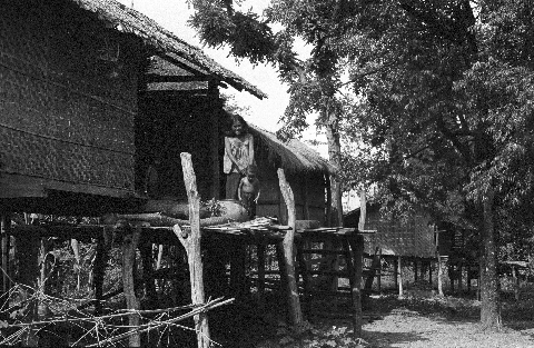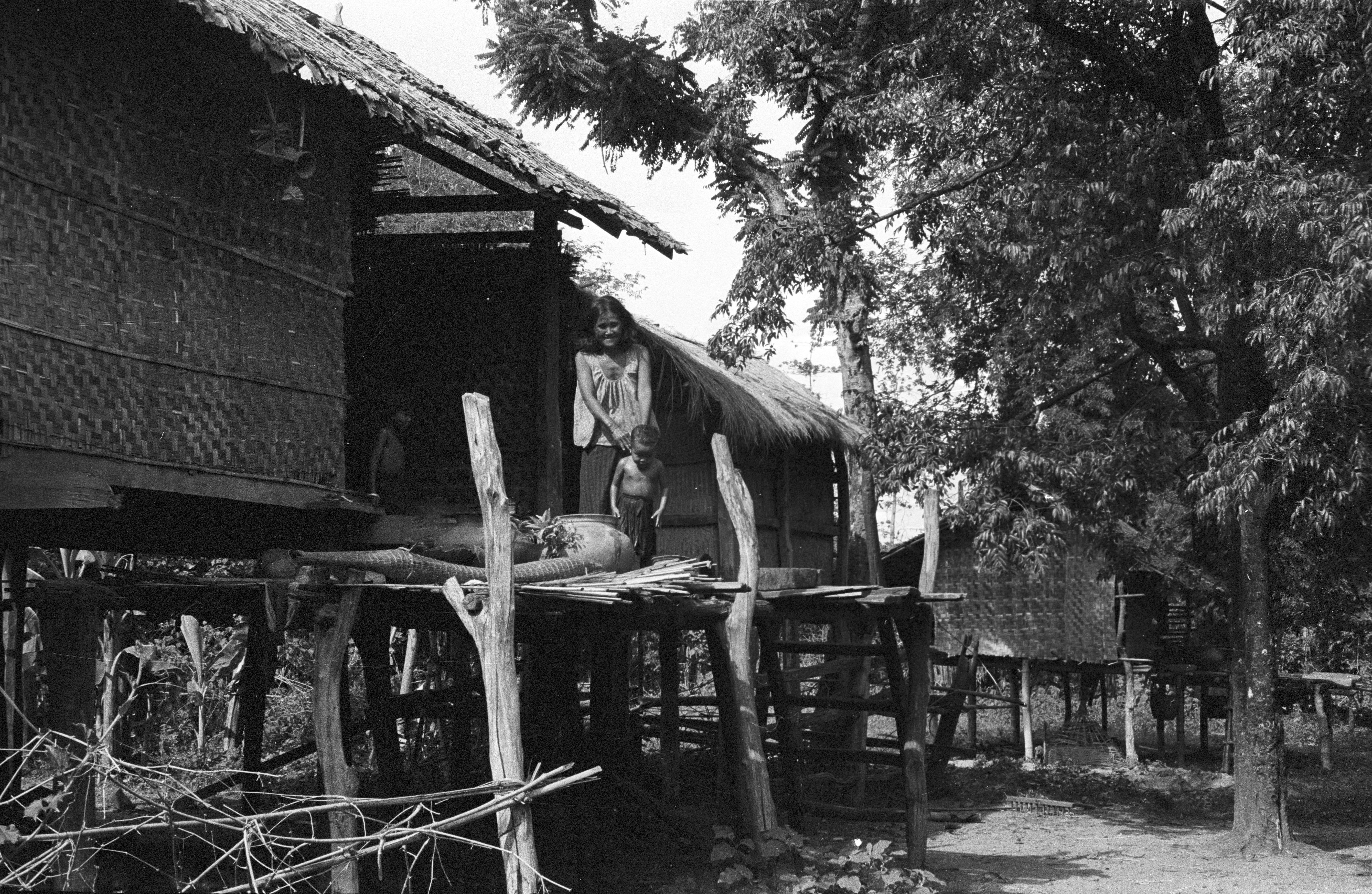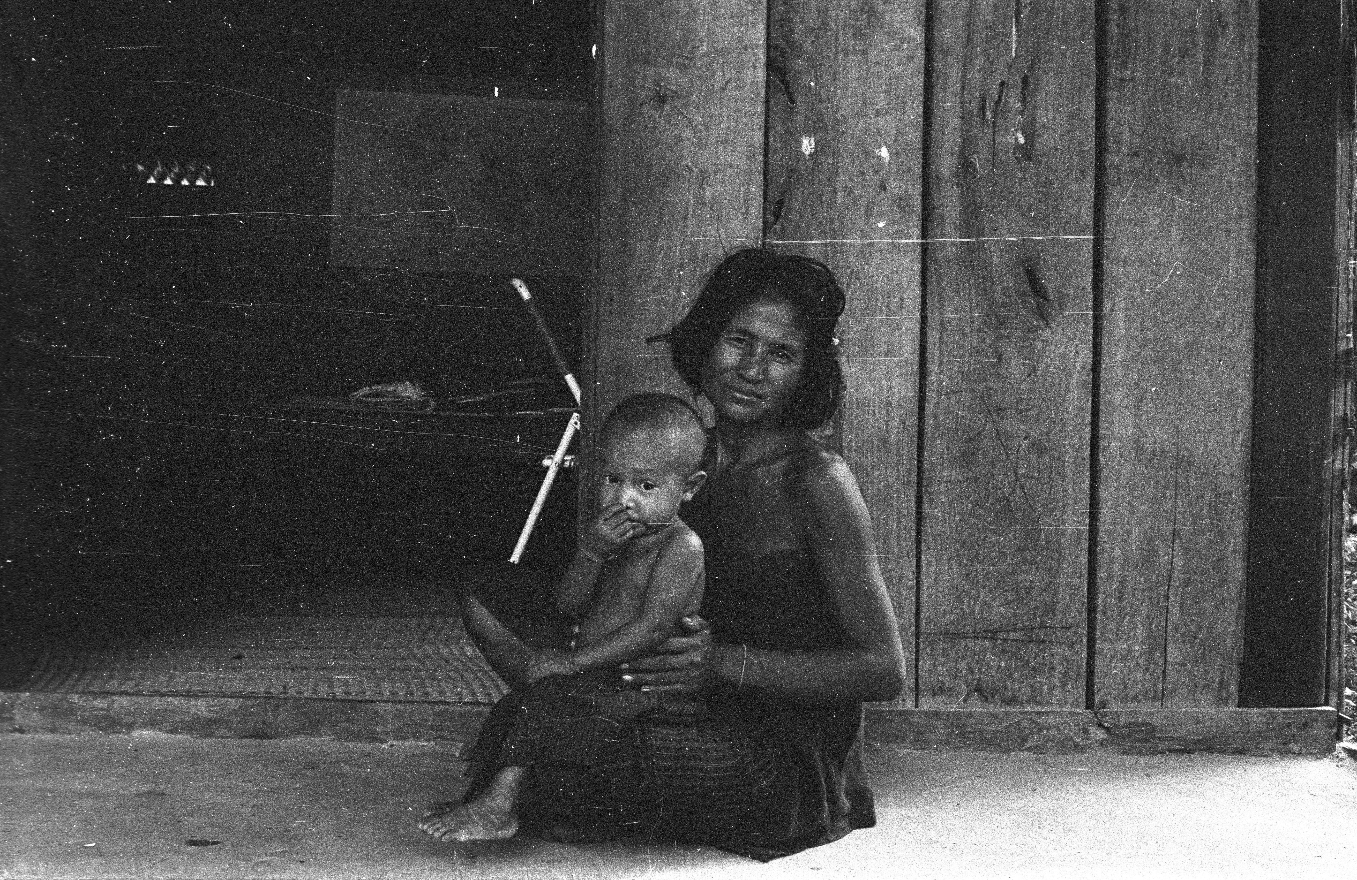 Mother and child on porch of shop, 2 photos, Ban Nong Tun, Amphoe Muang, Changwat Maha Sarakham, Thailand, July 1963