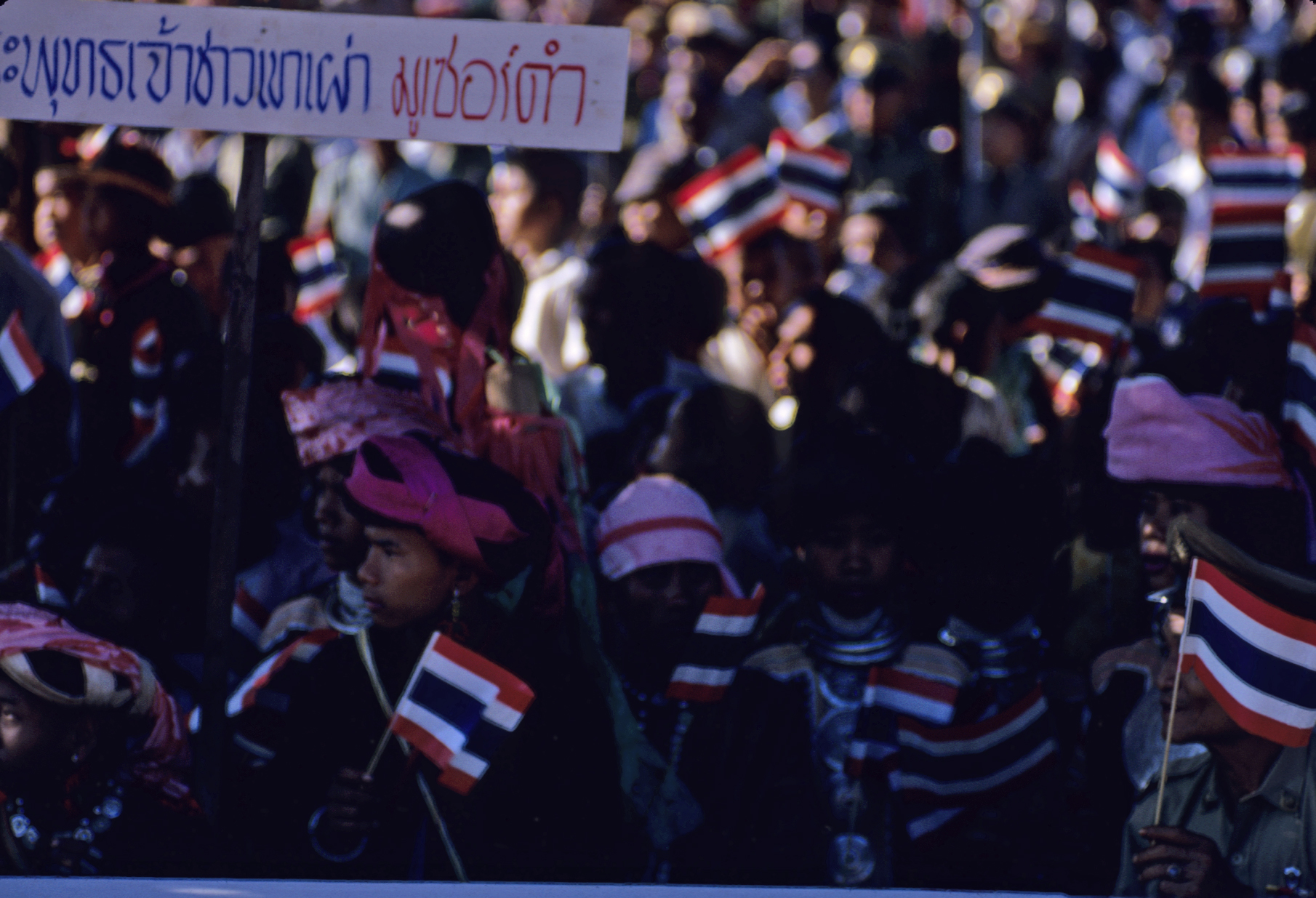Ceremony at which King Bhumipol dedicated a royally-cast Buddha image as the palladium of the province – Black Lahu waiting for King and Queen, Amphoe Muang Mae Hong Son, Changwat Mae Hong Son, Thailand, January 1968