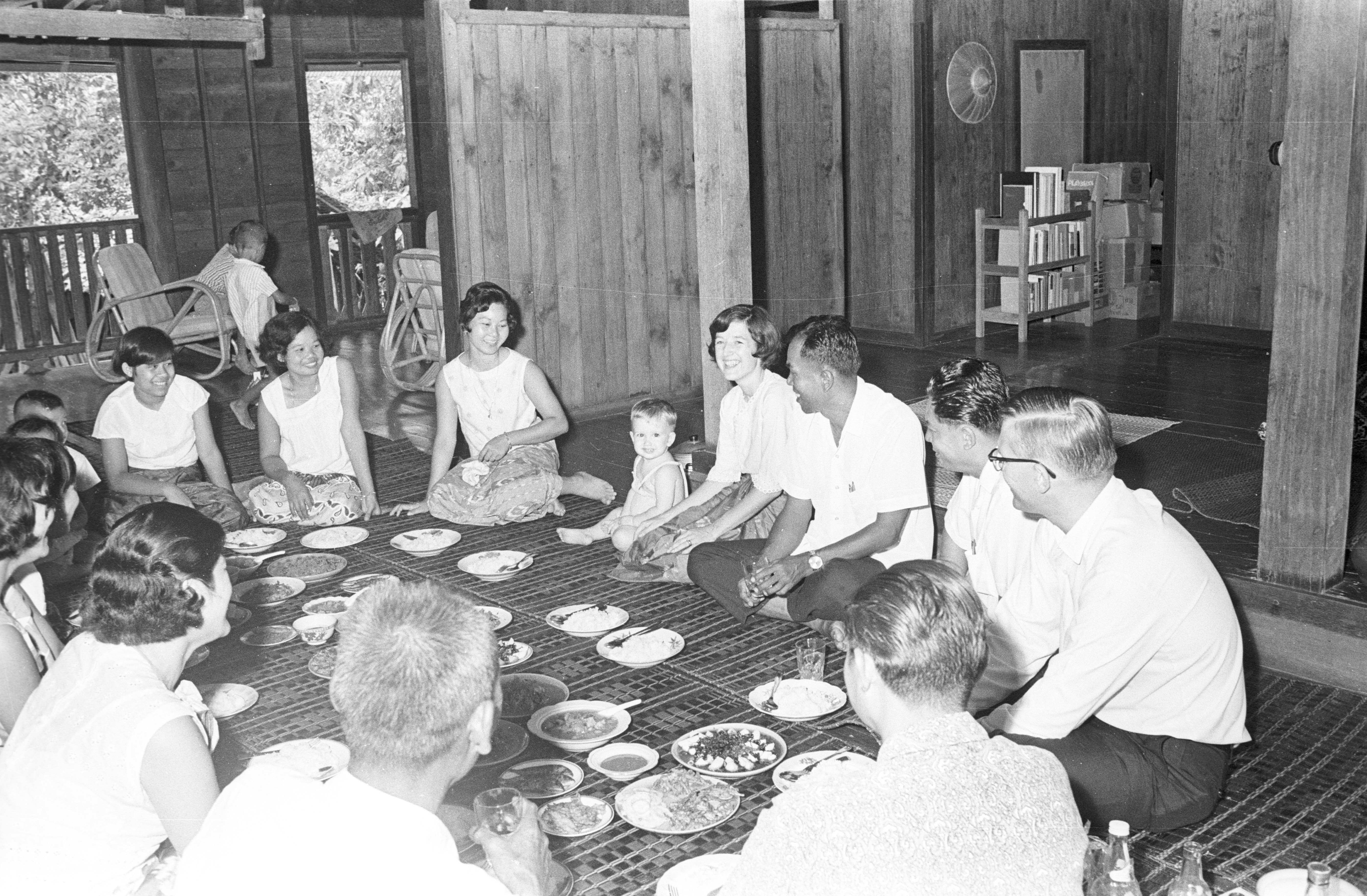 Liang phra for Nick Keyes's second birthday: feast for guests, 5 photos, Amphoe Mae Sariang, Changwat Mae Hong Son, Thailand, July 1968