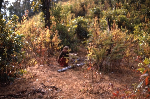 Karen woman squatting, on trail back from Bān Phāpae to Mae Sariang (blurry), Thambon Pa Pae, Amphoe Mae Sariang, Changwat Mae Hong Son, Thailand, January 1968