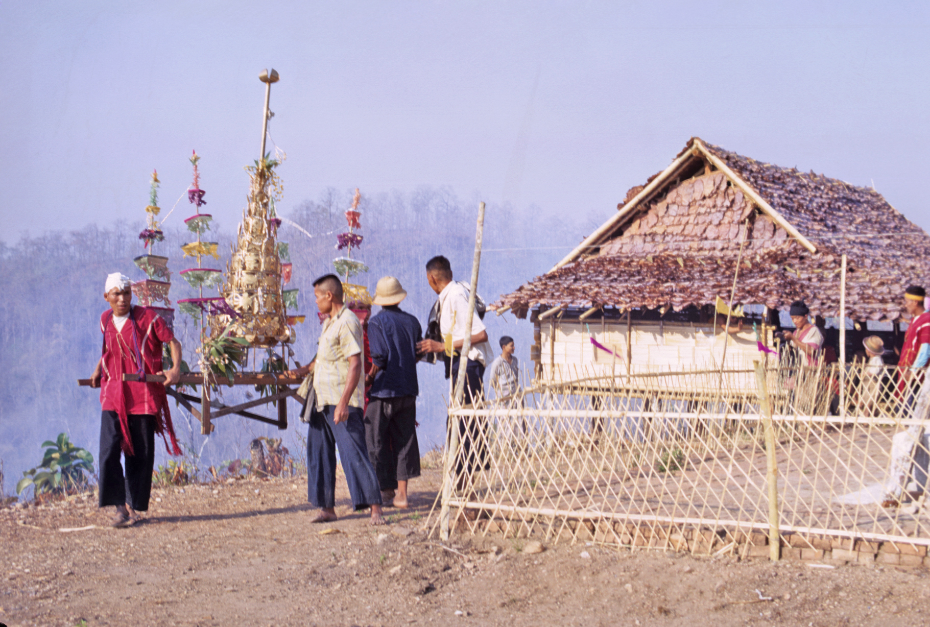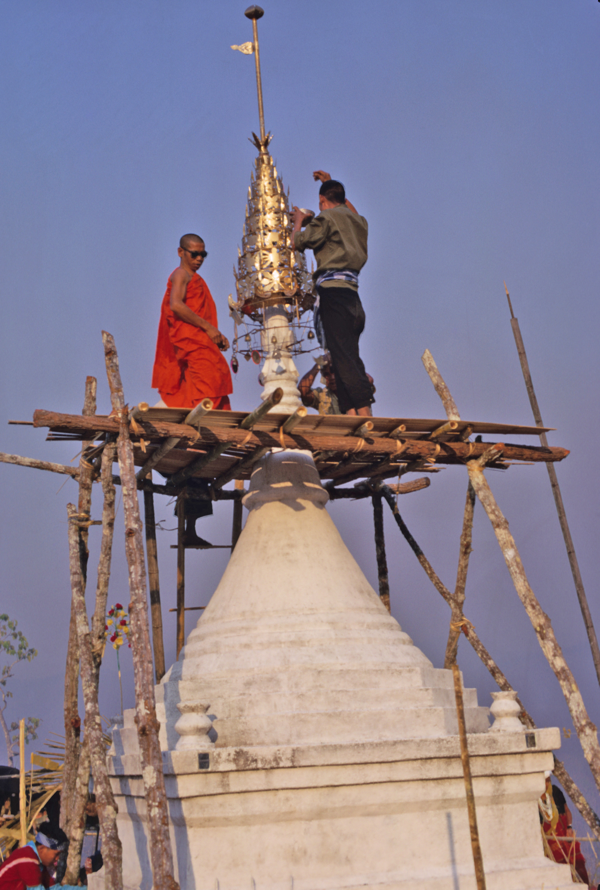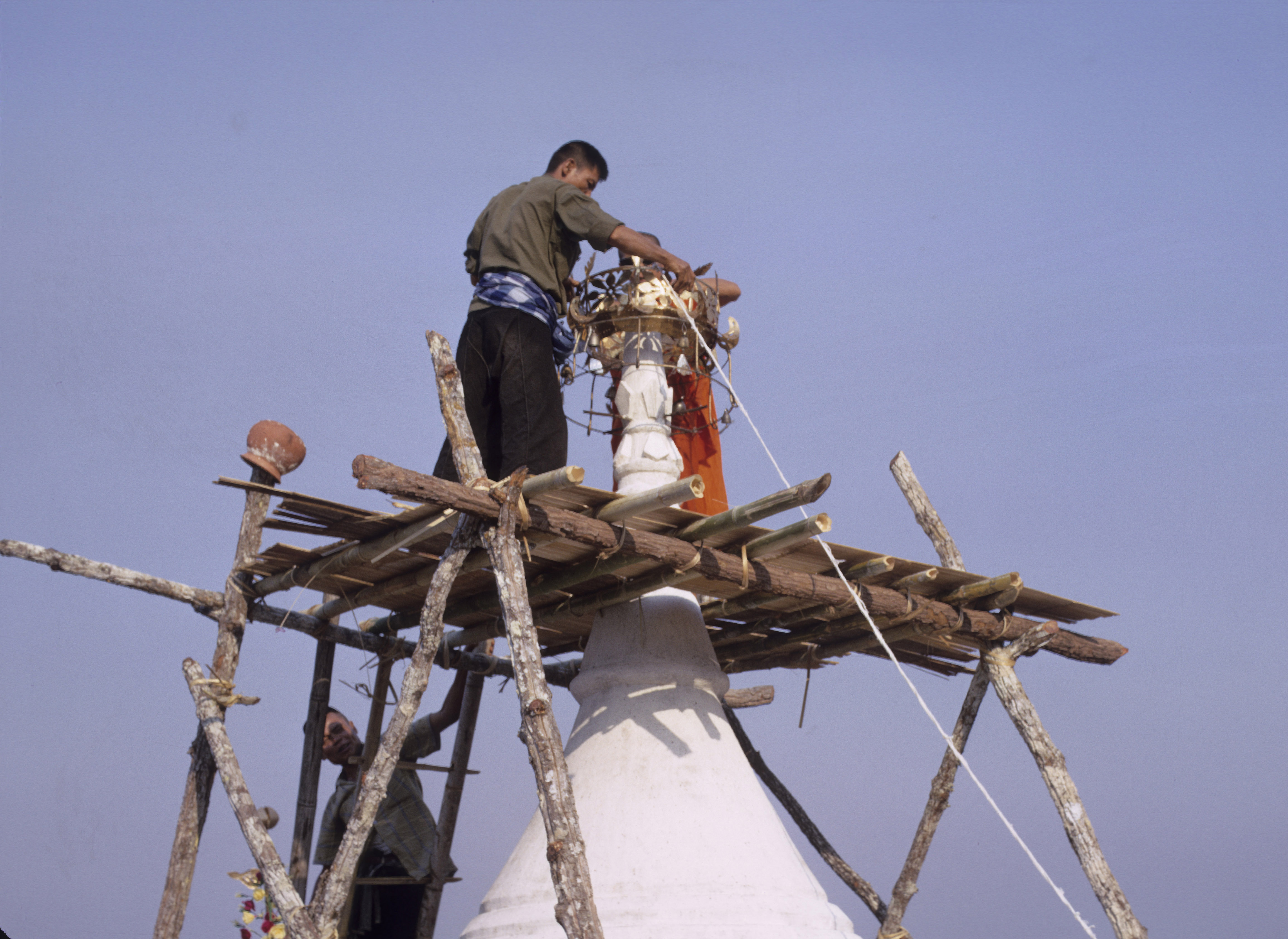 Dedication of new stupa (yôt Chēdī) – Karen men carrying crown of stupa (hti), fixing the crown (hti) on top of chedi, Karen man and monk placing crown of stupa (hti) in place on stupa, 4 photos, Ban Mae Top Nuea, Thambon Ban Kat, Amphoe Mae Sariang, Changwat Mae Hong Son, Thailand, March 1968