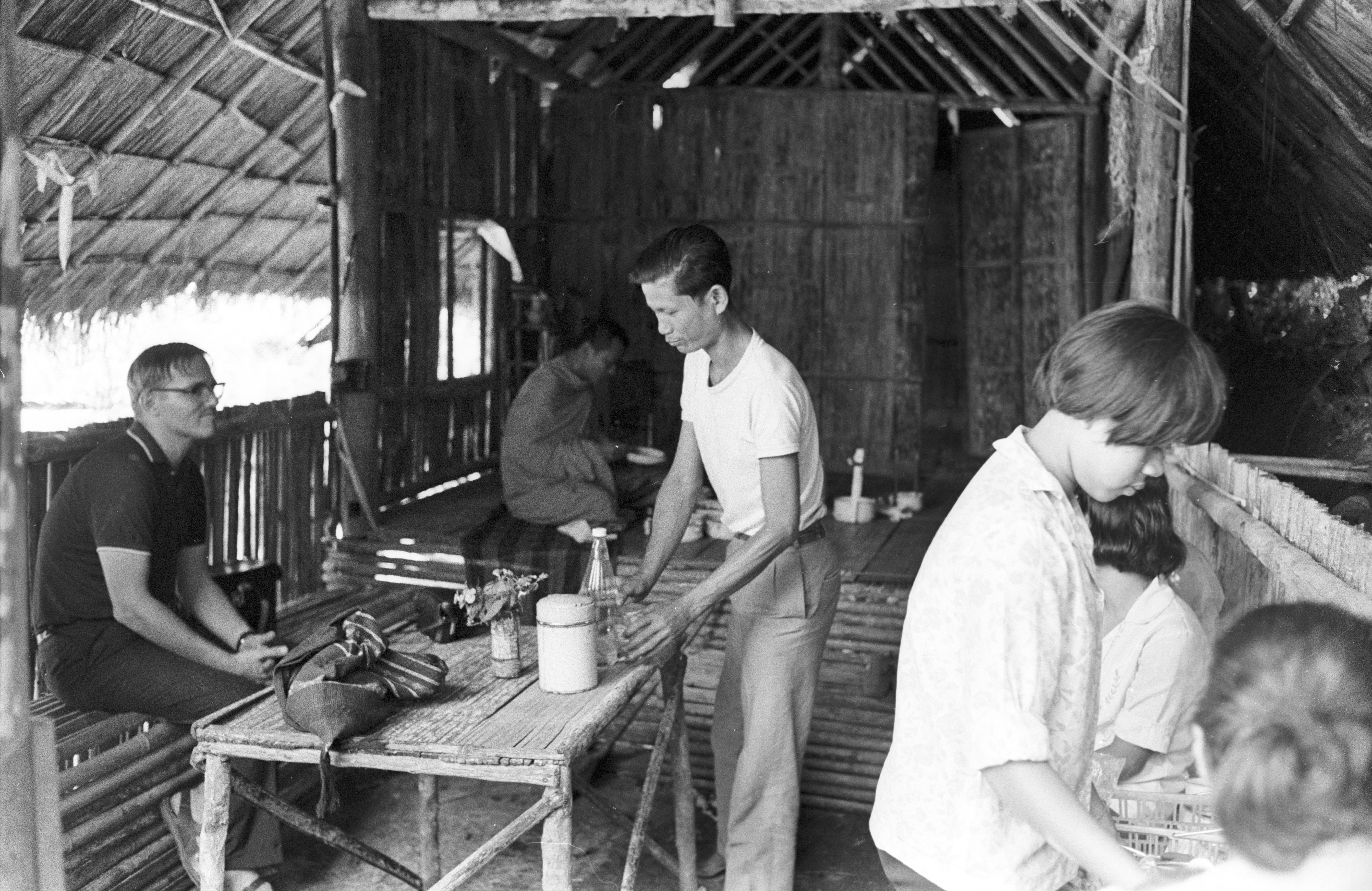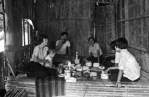 In house built for missionary monks: Biff (Charles Keyes), Čao Khana Amphoe's assistant, Phan preparing food, La-aw preparing food, family eating, 4 photos, Ban Huai Kung, Thambon Pa Pong, Amphoe Sop Moei, Changwat Mae Hong Son, Thailand, October 1968