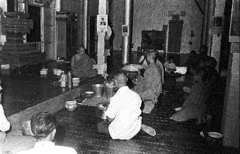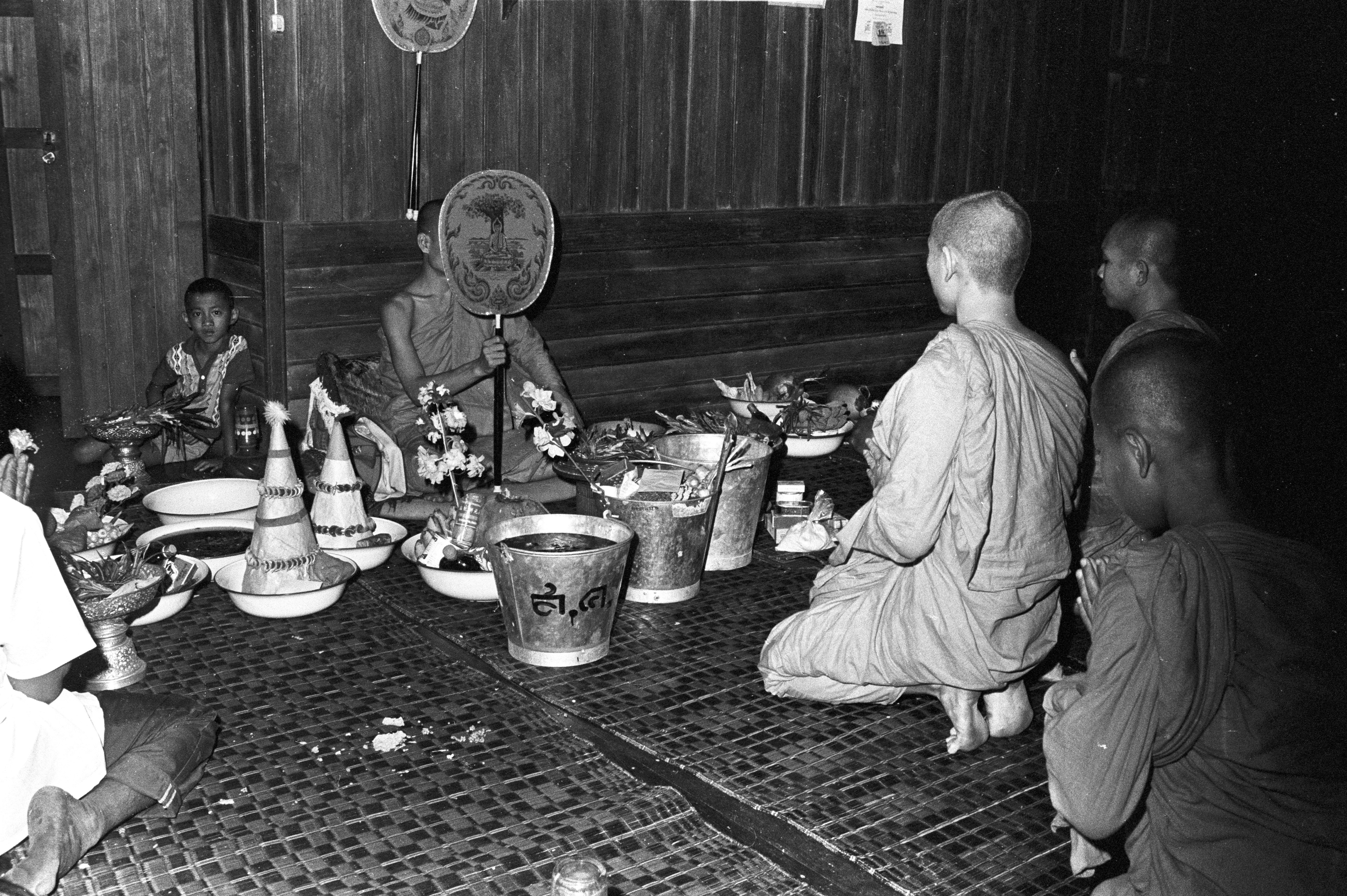 Wat Uthayārom: honoring senior monk, 2 photos, Amphoe Mae Sariang, Changwat Mae Hong Son, Thailand, April 1968