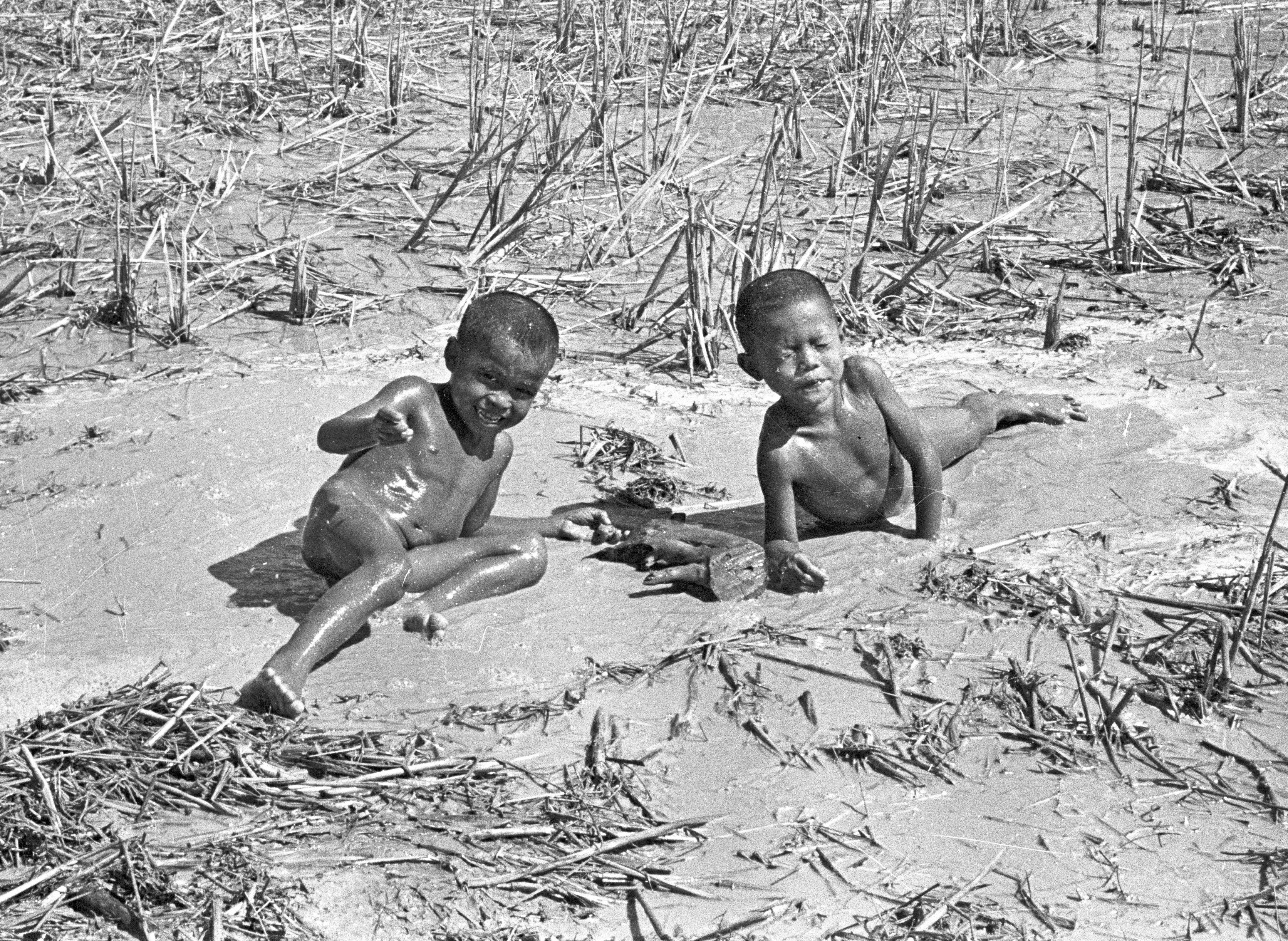 Children playing in the mud of a pond, Changwat Maha Sarakham, Thailand, January 1964