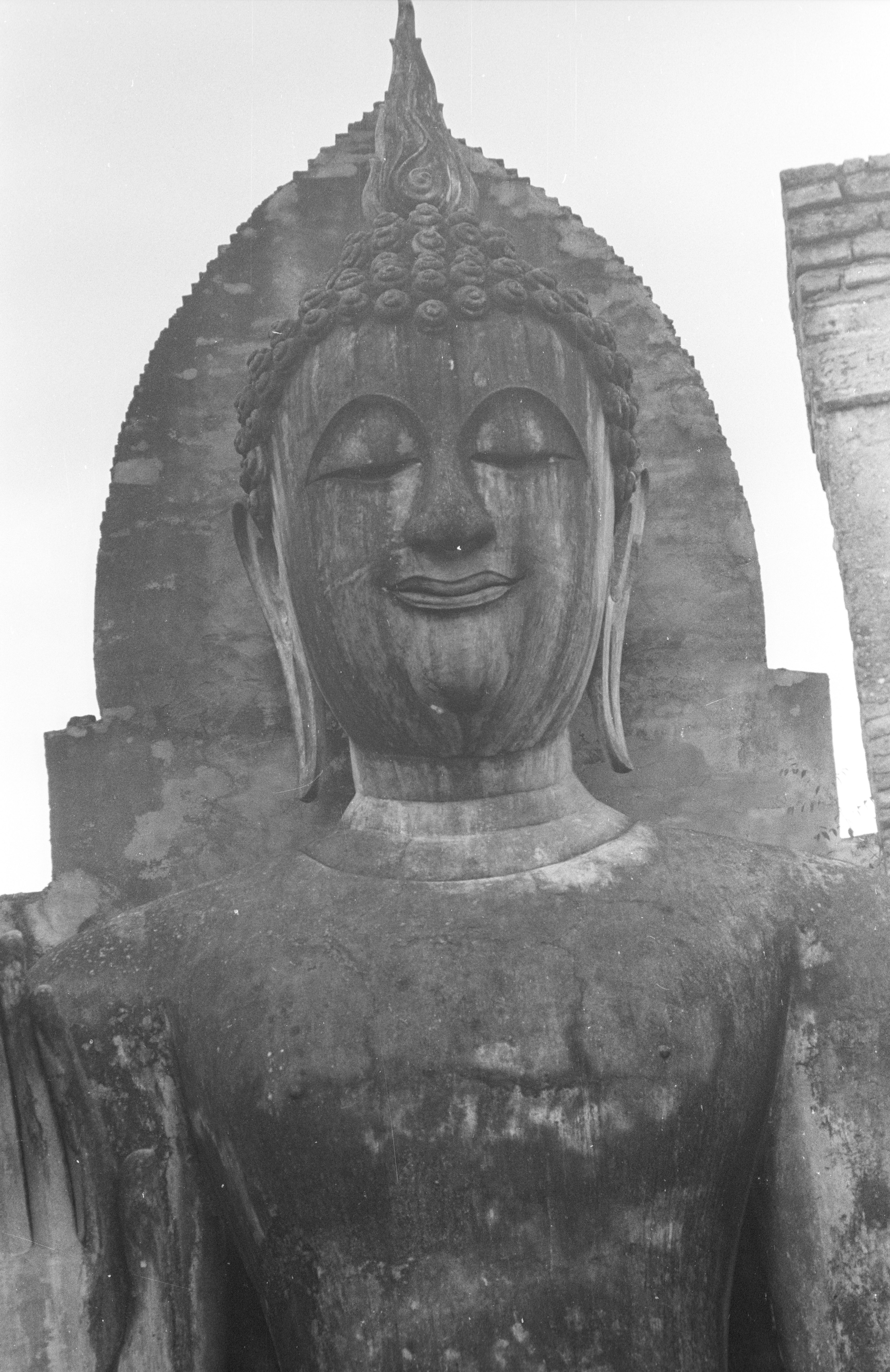 Close up of face of large standing image, Changwat Sukhothai, Thailand, August 1968