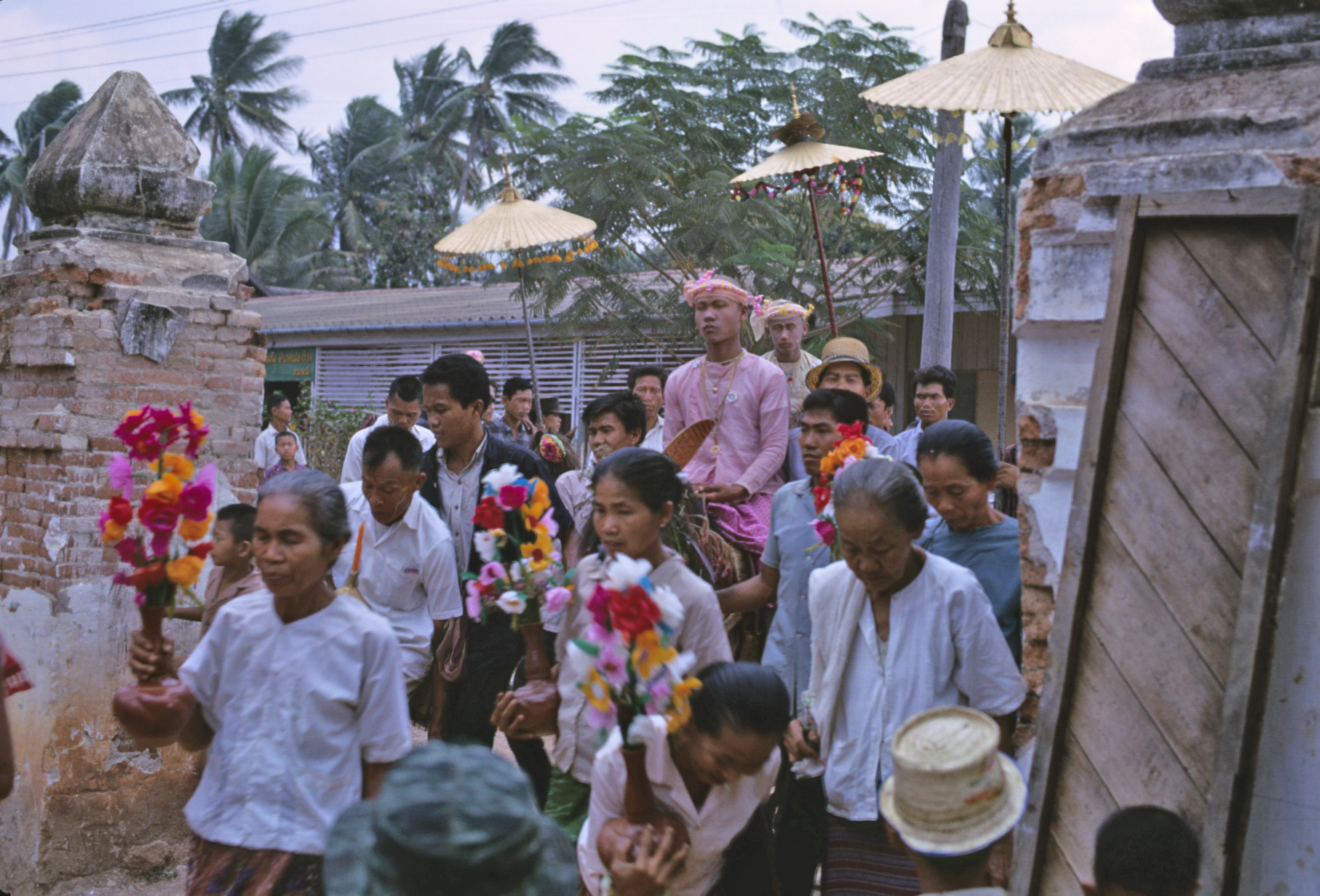 Ordination – Procession of the "jewel child" (hāē lūk kāēo) entering grounds of Wat Kittiwong, 4 photos; circling the ordination hall of Wat Kittiwong, 1 photo, Amphoe Mae Sariang, Changwat Mae Hong Son, Thailand, March 1968