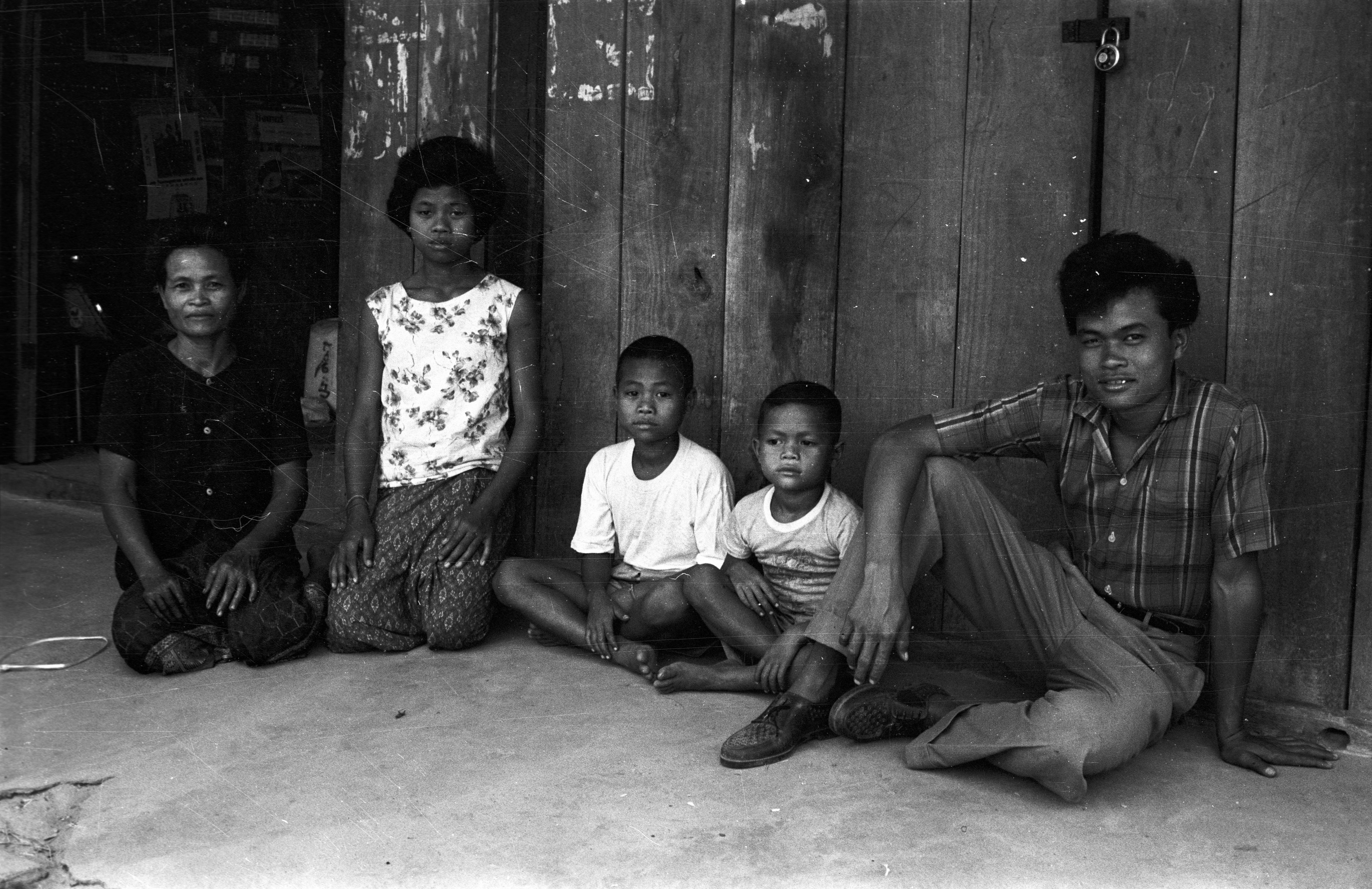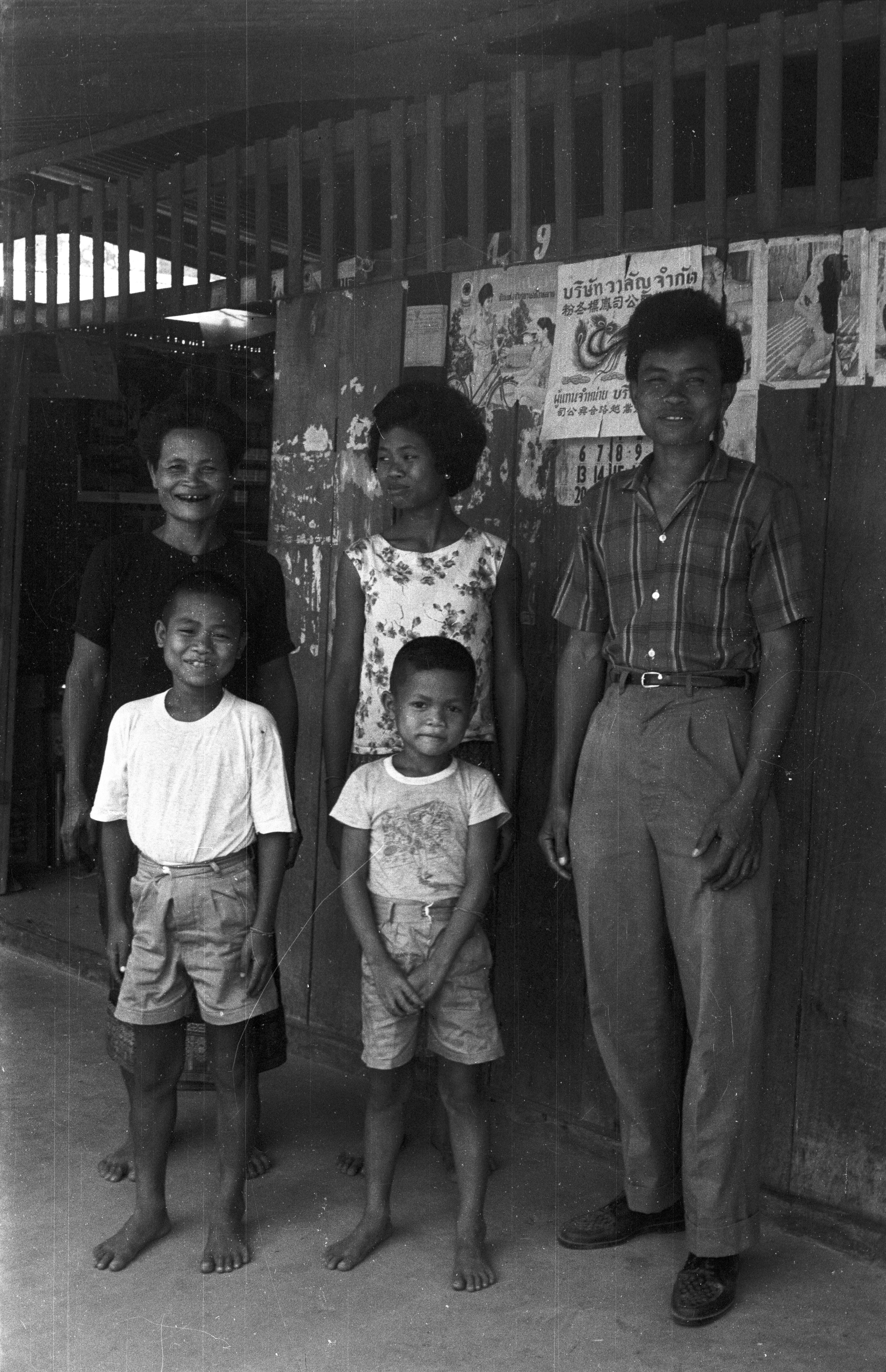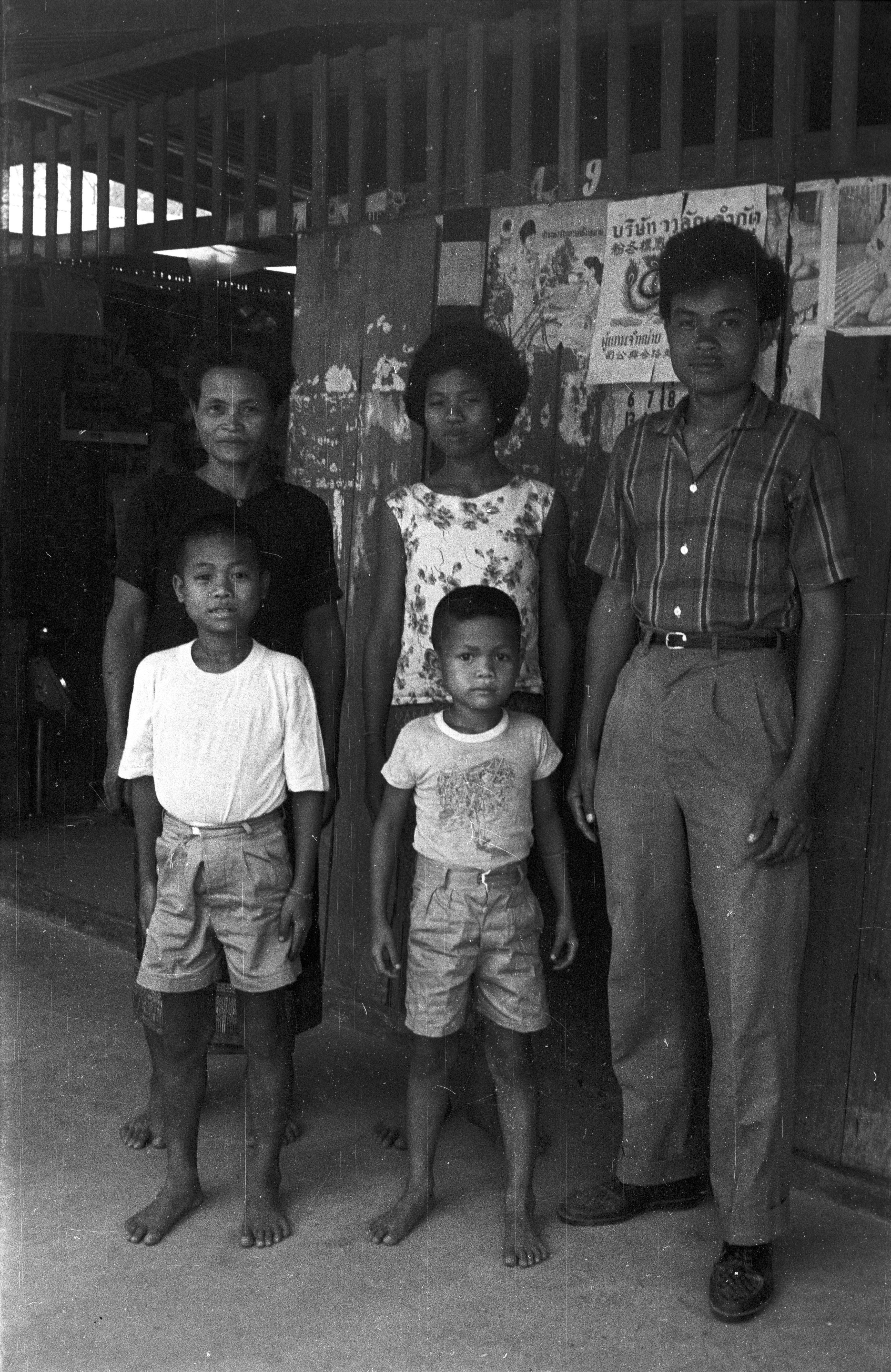 Group of villagers in front of shop, 5 photos, Changwat Maha Sarakham, Thailand, March 1964