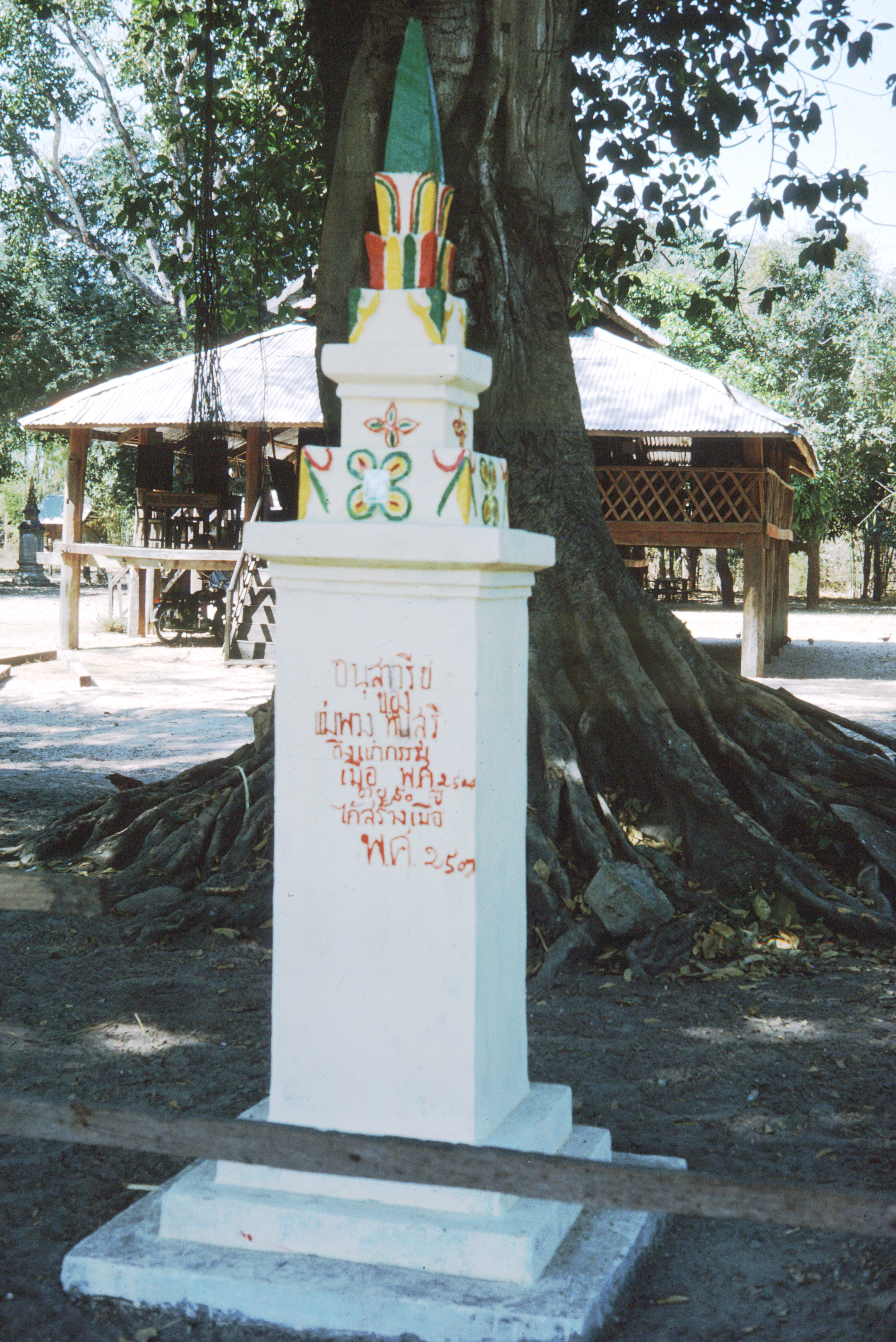Newly constructed thāt (reliquary) at wat; inscription by Mr. Choei; Bān Mô (Ban Mo) village, A. Muang, Changwat Maha Sarakham, 1963 or 1964