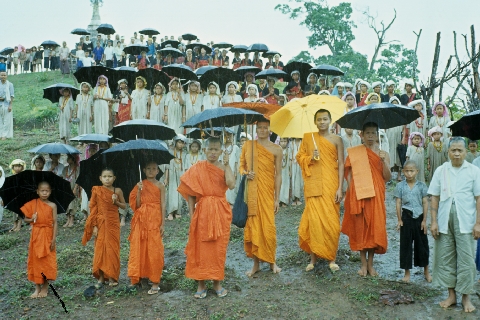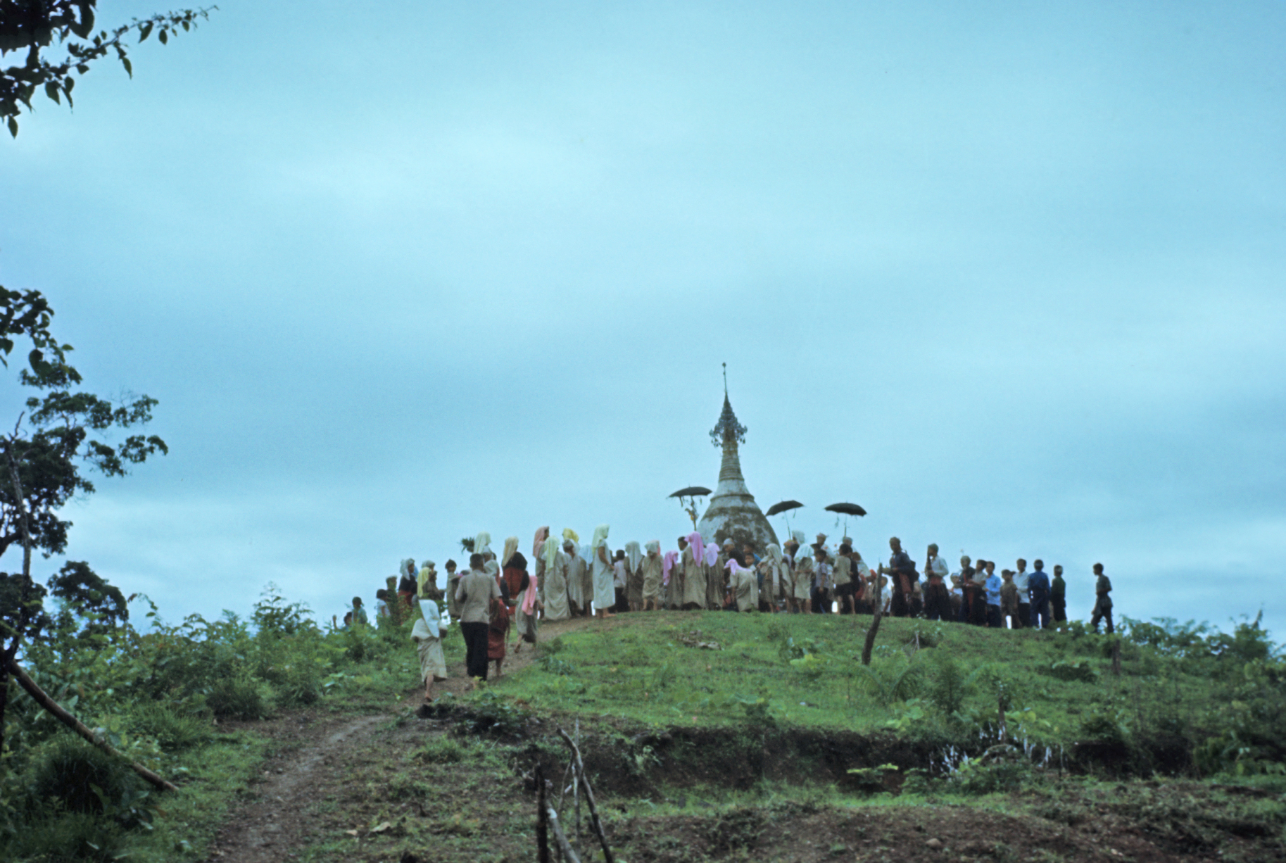 Ordination of Karen novices – Karen and monks and new novices on hill below stupa, 2 photos, Ban Pa Mak, Thambon Ban Kat, Amphoe Mae Sariang, Changwat Mae Hong Son, Thailand, June 1968