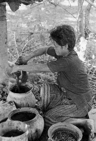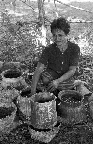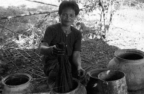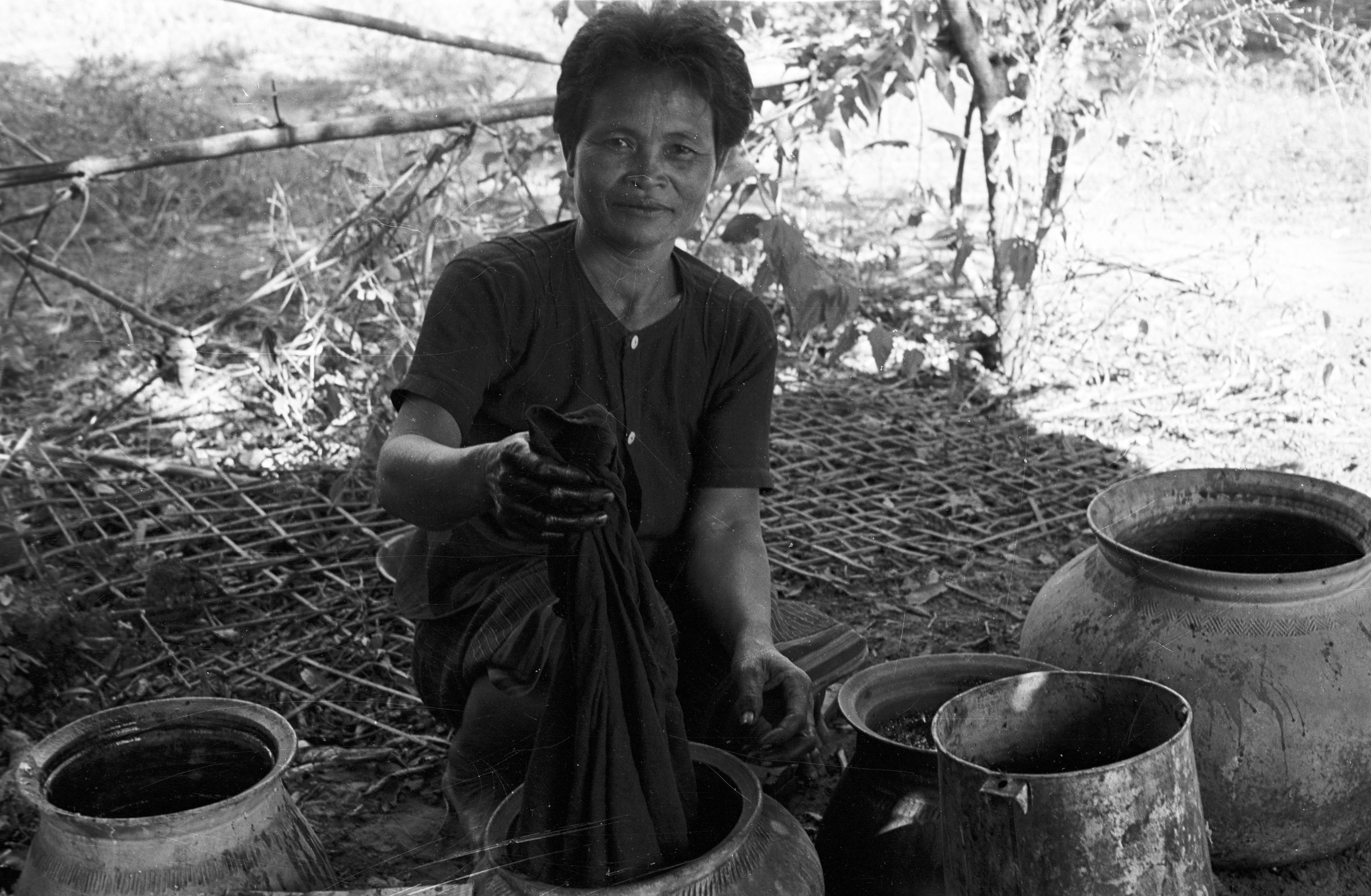 Village woman dyeing (yôm) cotton thread and cloth, 3 photos, Ban Nong Tun, Amphoe Muang, Changwat Maha Sarakham, Thailand, December 1963