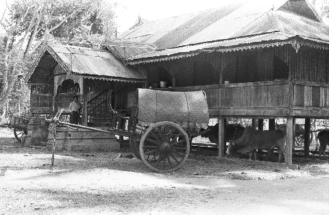 Ox cart in front of house behind hotel, Amphoe Muang Mae Hong Son, Changwat Mae Hong Son, Thailand, March 1968