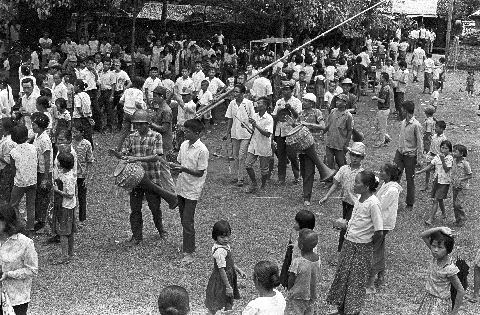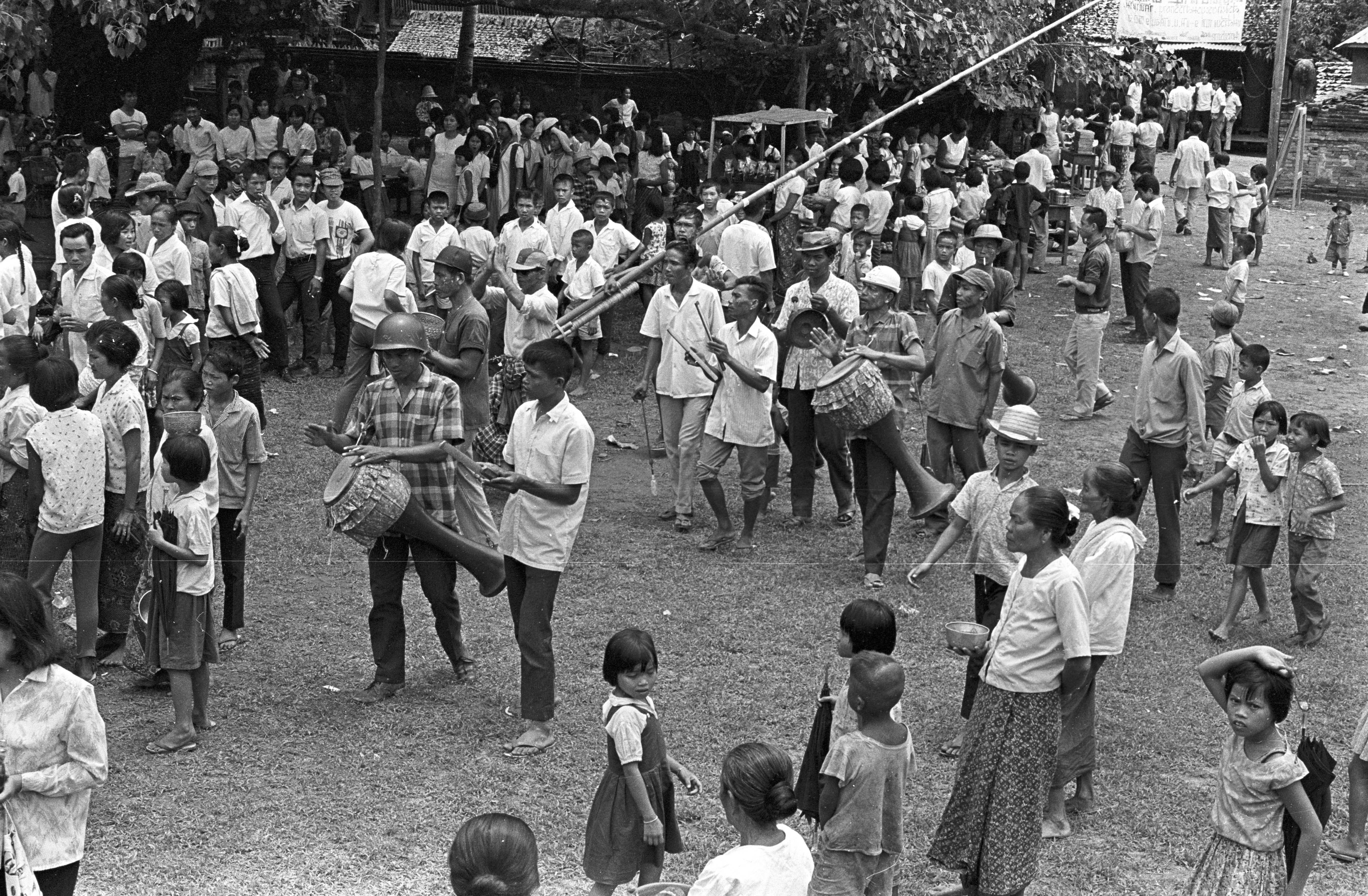 Wat Thā Khām: bathing relic / song nām phra thāt (สรงน้ำพระธาตุ): placing relic in bathing apparatus outside; villagers with musicians in front of relic; 2 photos, Ban Si Don Chai (Ban Tha Kham), Amphoe Mae Sariang, Changwat Mae Hong Son, Thailand, June 1968