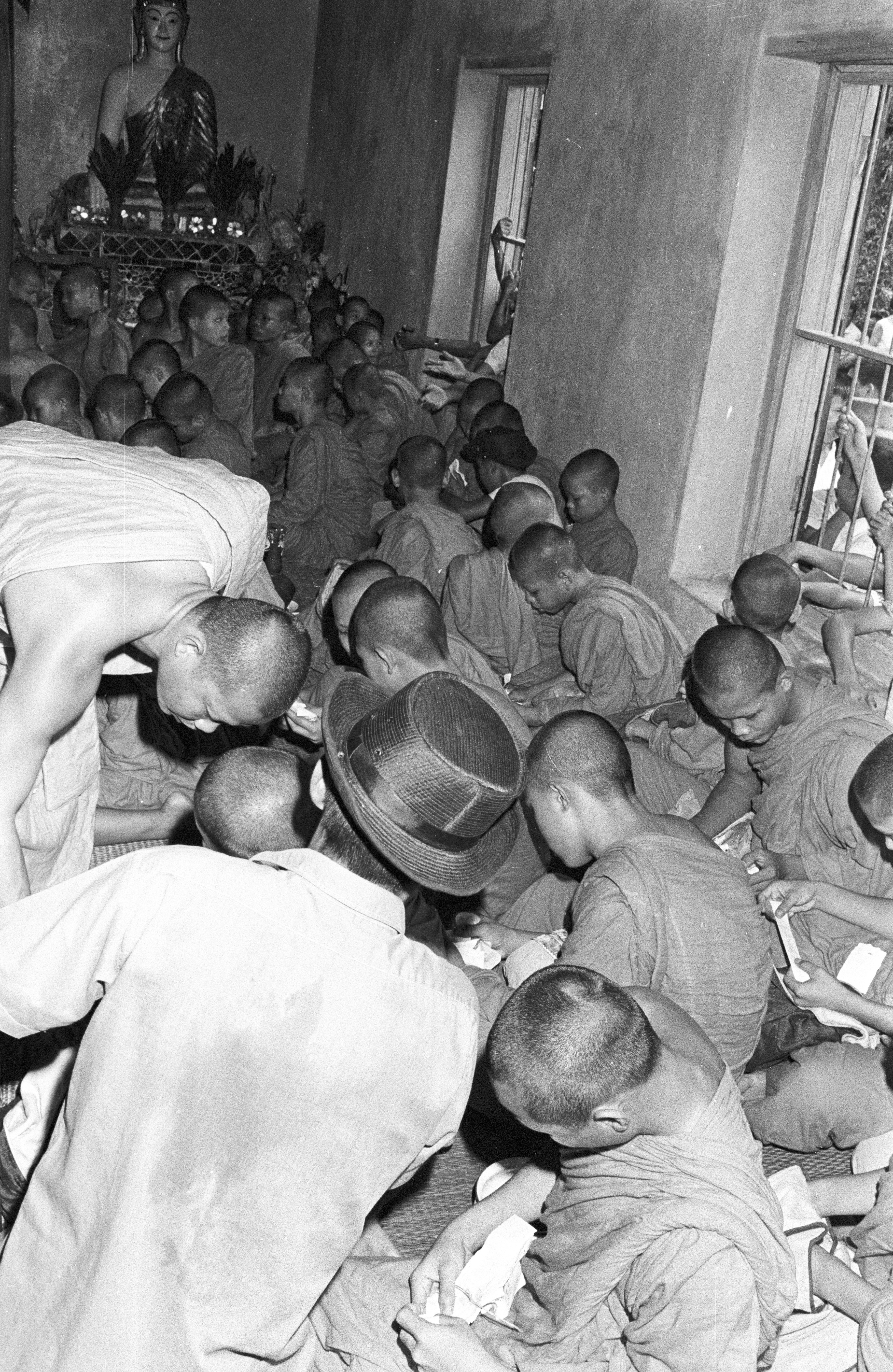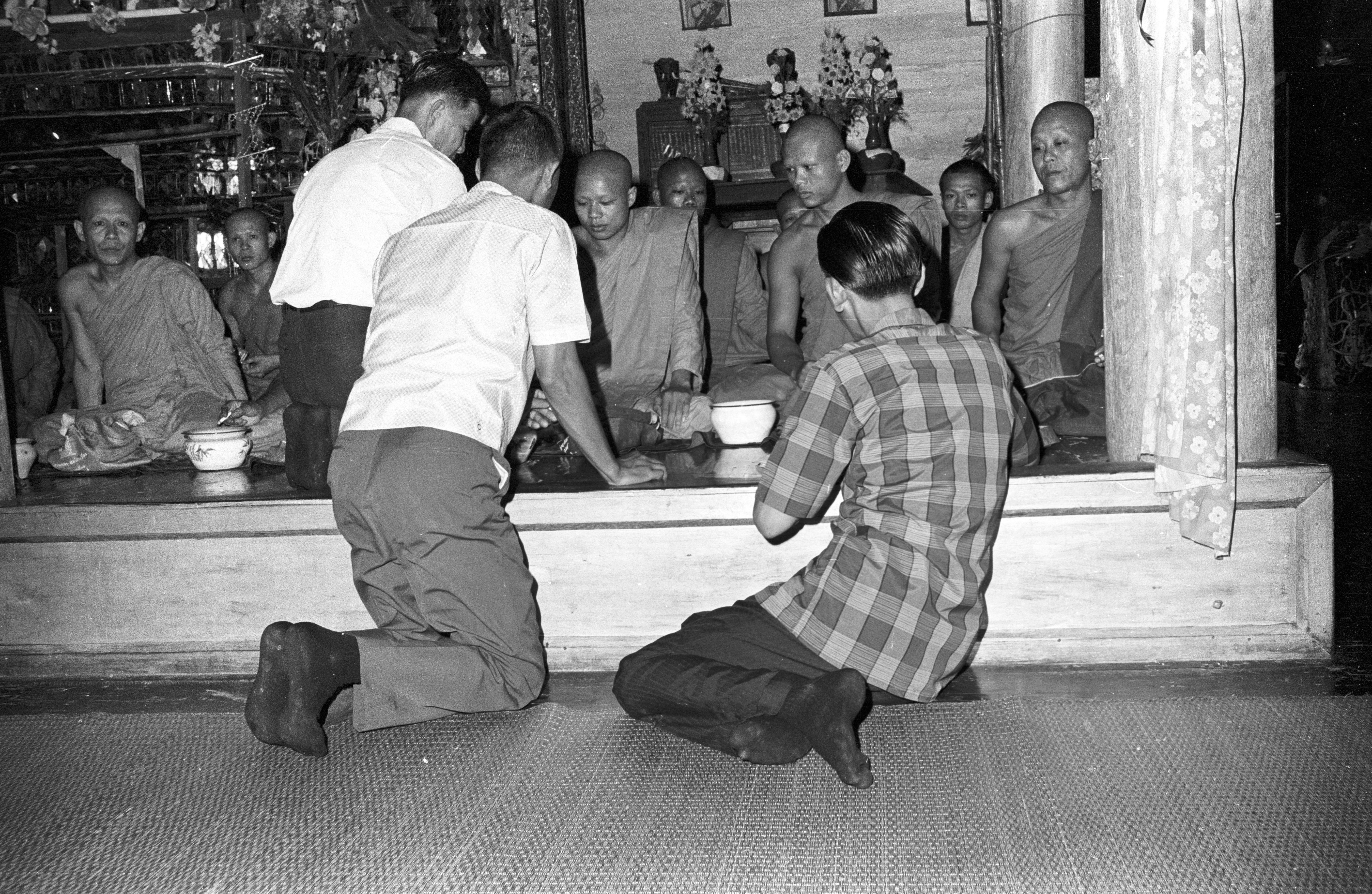 Wat Ommārawāt: offering alms by lottery (tān tāēn ทานแทน (ตานแตน): men preparing slips in front of monks (3 photos); monks & novices reading their slips to determine who is making an offering to whom (3 photos), Amphoe Mae Sariang, Changwat Mae Hong Son, Thailand, September 1968