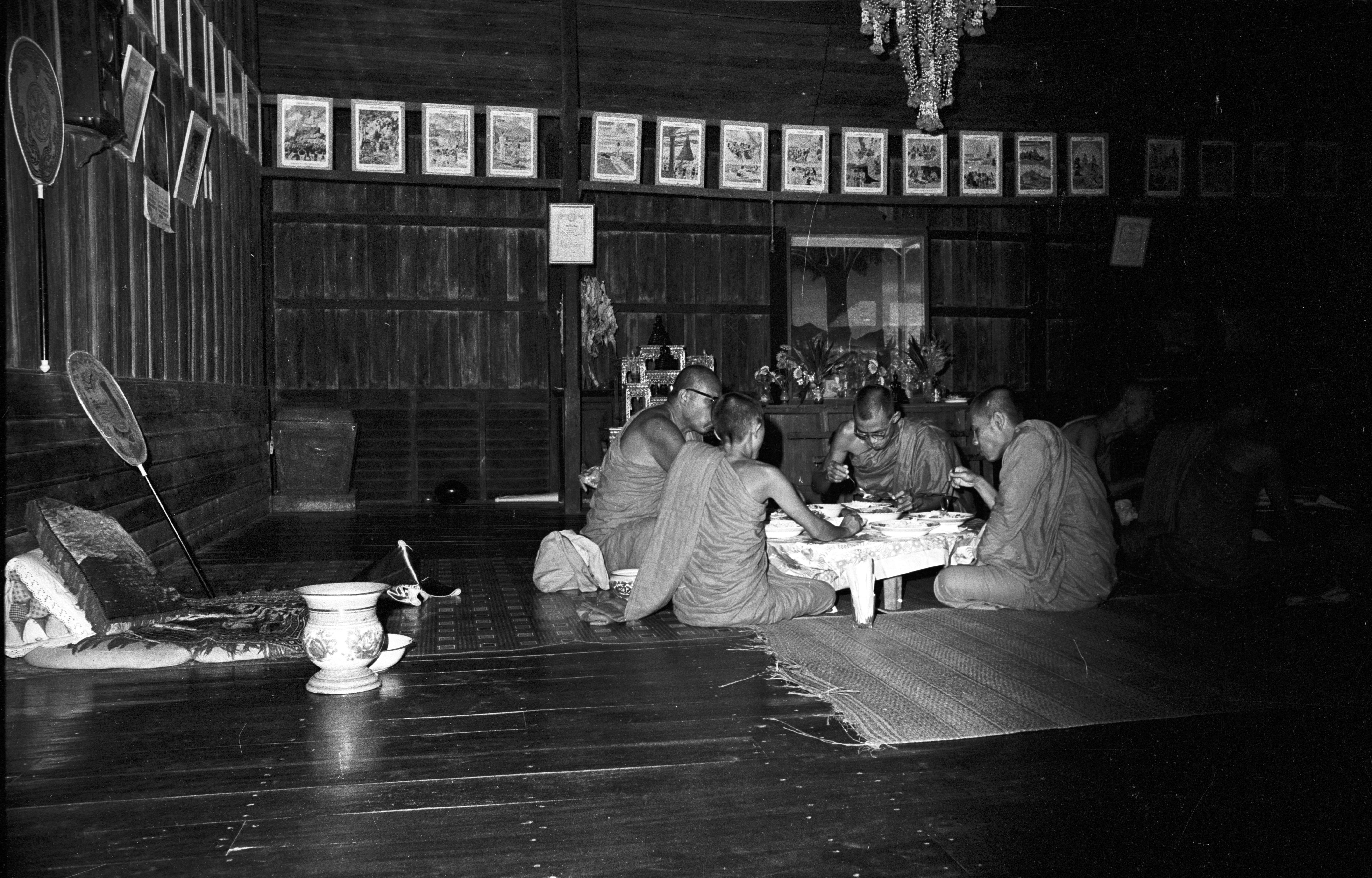 Wat Sitthimongkhon: salākhaphat ceremony; monks eating, 4 photos, one with Charles Keyes setting up tape recorder, Mae Hong Son Province, Thailand, September 1967