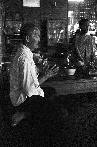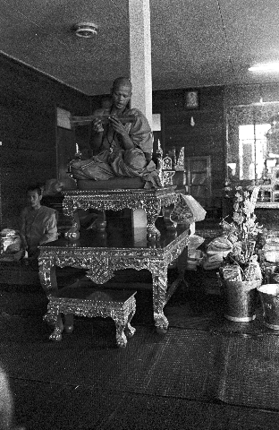 Wat Kittiwong: ordination -- lay leader leading offering; pulpit; lay leader leading request for sermon; new monk reading sermon; 4 photos, Amphoe Mae Sariang, Changwat Mae Hong Son, Thailand, July 1968
